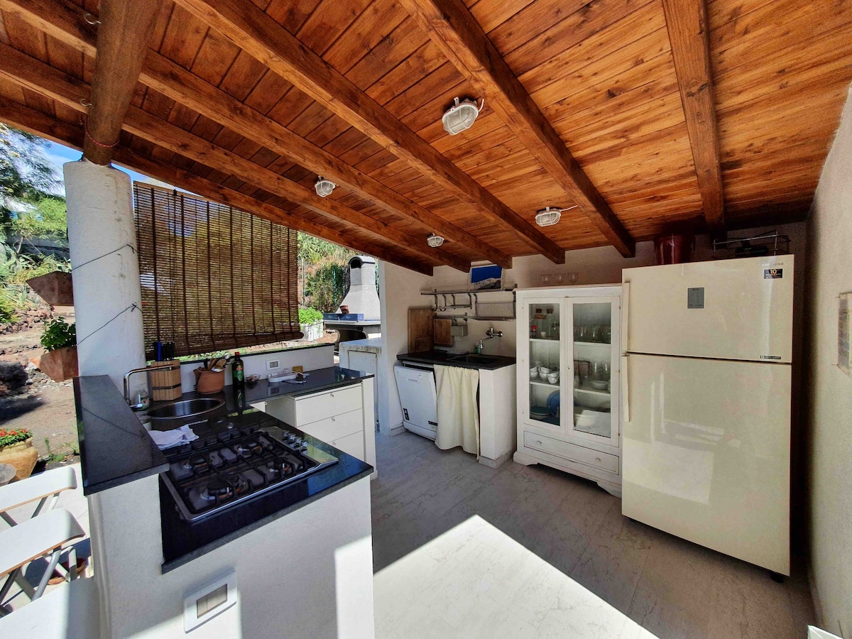 The house is located in the area called 'Cappero'. The house was originally built in 1900 and was refurbished in 2012. It is a traditional Aeolian style villa. Facing the front yard is a wooden awning supported by Aeolian style pillars called 'pulera'. The seafront terrace overlooking the Vulcano Island is surrounded by a low-rising platform called 'bisola' delicately adorned with Sicilian ceramic tiles. The house is surrounded by 1500 square metres of garden space.