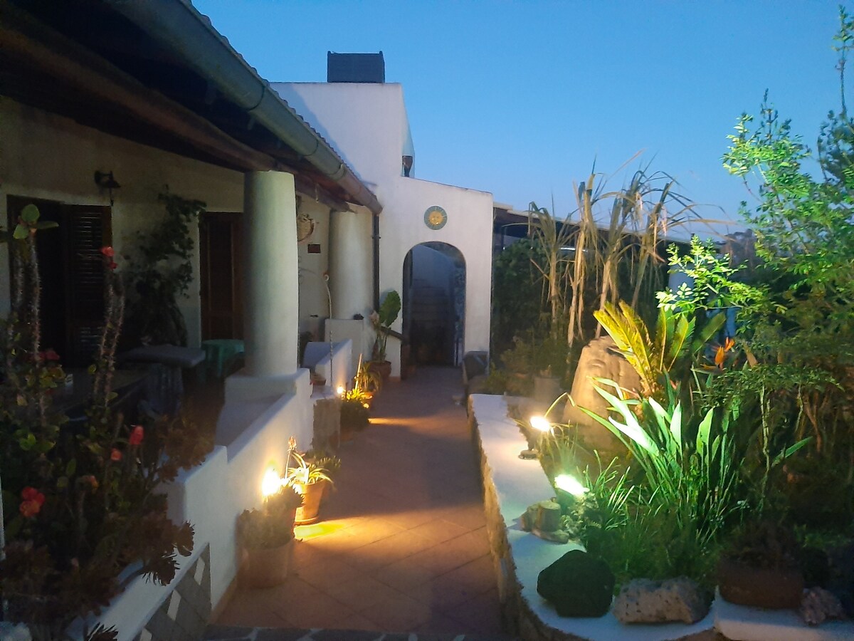 Casa eólica encaramada en una catedral volcánica de Lipari Sud, y rodeada de vegetación. Impresionantes vistas del pueblo (castillo y puerto), Panarea y Stromboli e islotes salvajes. Desayuno y comida local incluidos en el precio. Esta es la última casa de Monte Gallina (cúpula volcánica del sur de Lipari) rodeada de verde (maquis mediterráneos y jardines). Impresionante vista de la antigua ciudad de Lipari, Panarea y Stromboli, islas salvajes y costa italiana. Desayuno, comida hecha a mano, agua potable incluida.