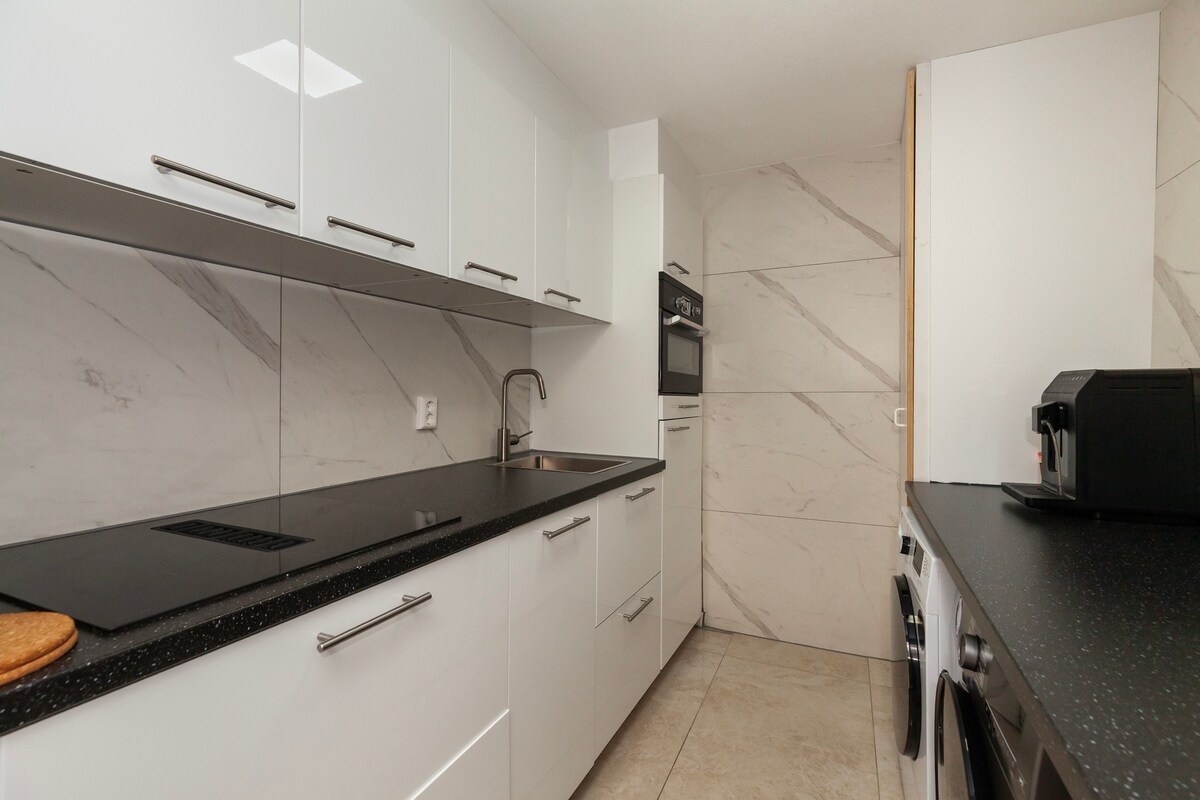 Amplio y elegante estudio para amigos y familiares, que puede alojar hasta 4 huéspedes. Cama tamaño queen y sofá cama para dormir cómodamente. Cocina con nevera, estufa, microondas/horno, lavavajillas y máquina Nespresso. Sala de estar y comedor con sofá, TV, conexión Wi-Fi gratuita y espacio de trabajo. Baño moderno con ducha efecto lluvia, artículos de tocador y secador de pelo. El apartamento tiene un sistema de control de clima.