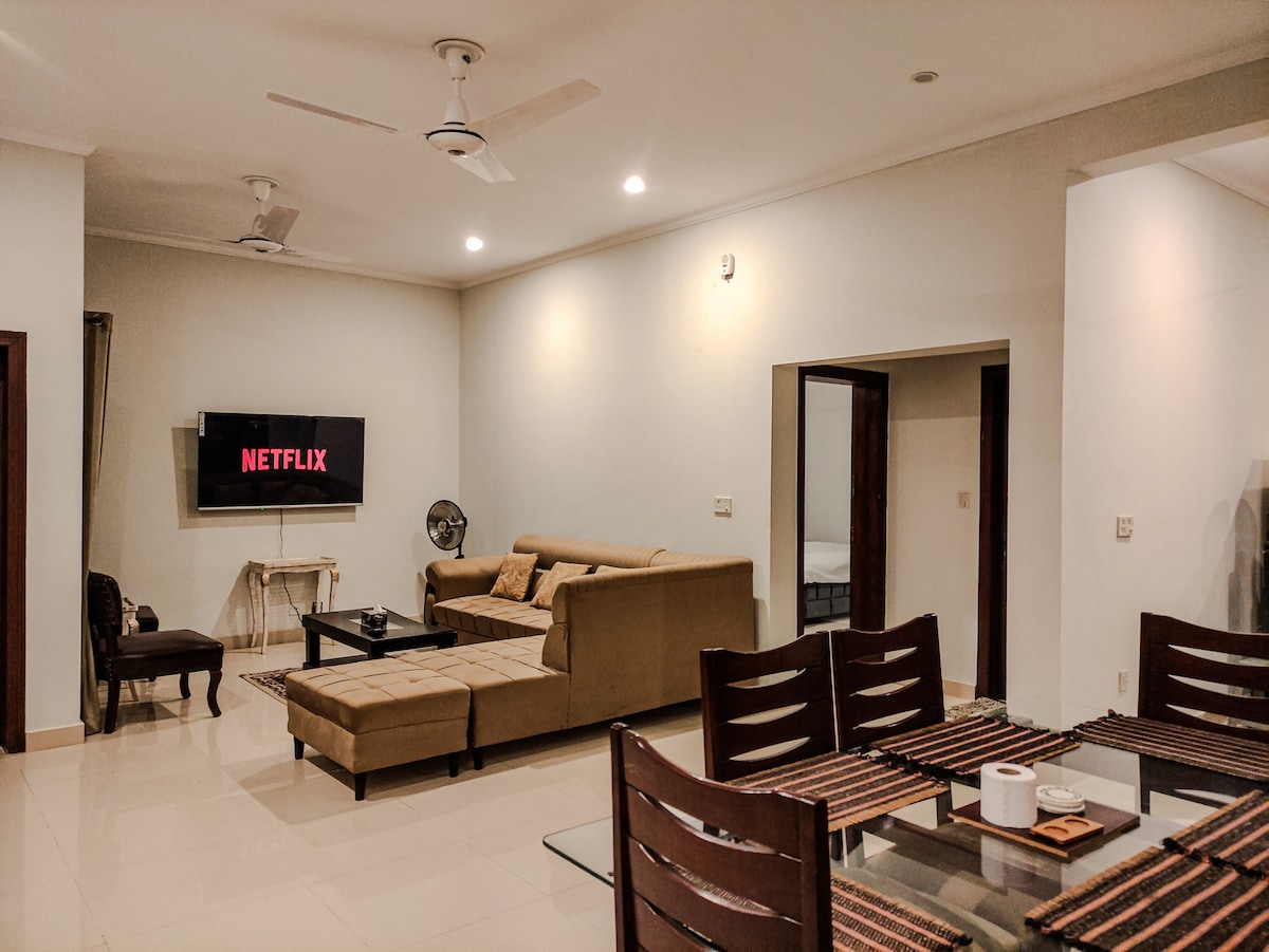 If you are looking for a luxurious stay in the heart of Islamabad closest to nature this is the place for you. A scenic rooftop residence within an elegant Alexa-enabled smart home, featuring voice-controlled lighting and comfort. Fully private space with private entrance, a huge terrace, kitchen, bath, living room, a 55" Smart TV, Heat & Cool Inverter AC, uninterrupted high-speed WiFi, Netflix, and XBOX-360 with 30+ games. Breakfast, Jacuzzi (in summers) & Suana is available at extra cost.