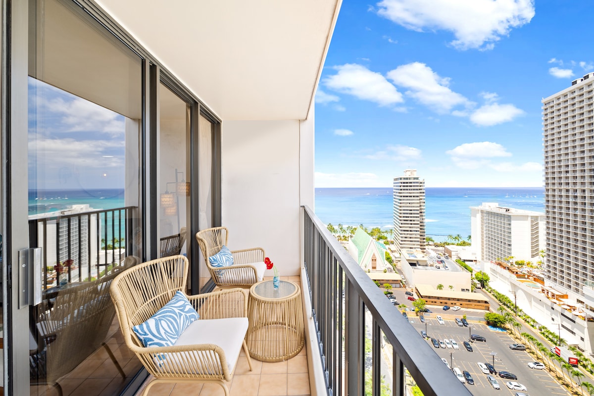 Renovated 1 bedroom/1 bathroom top floor apt in Waikiki. Beautiful 180 unobstructed panoramic ocean views from the Juliet balcony. See the Friday night fireworks and the sunset from the top! Queen size bed in bedroom. Bathroom has double sink, glass walk-in shower. Fully stocked kitchen. 24/7 security on site. Central A/C, Cable, WiFi included. Garage parking available for $35 a day. Five minute walk to Waikiki beach, Hilton hotel, Duke lagoon, and Ala Moana mall