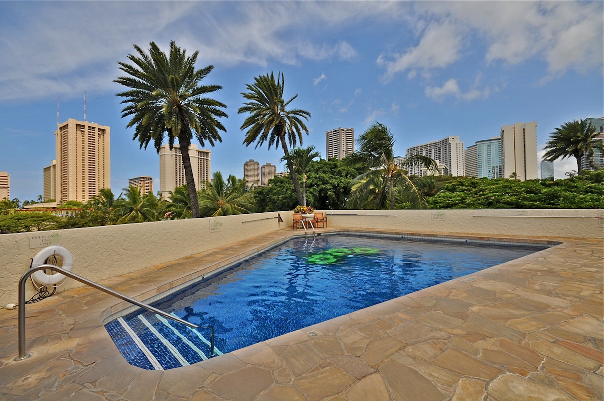 La unidad tiene capacidad para 4 personas, con una cama tamaño queen, un sofá cama de tamaño completo, todas las sábanas/toallas (playa y baño) incluidas. Recientemente se actualiza con un baño privado renovado, iluminación modernizada, nueva tapicería tropical, nuevo televisor inteligente, nevera nueva, aire acondicionado y todos los nuevos accesorios de plomería. Armario grande con equipo de seguridad y esnórquel, mesa de comedor, lanai privado, vista a la zona de la piscina/parque o a la bulliciosa avenida Kalākaua. Artículos de aseo de baño, secadores de pelo, 2 portaequipajes y cocina pequeña completamente equipada incluida.