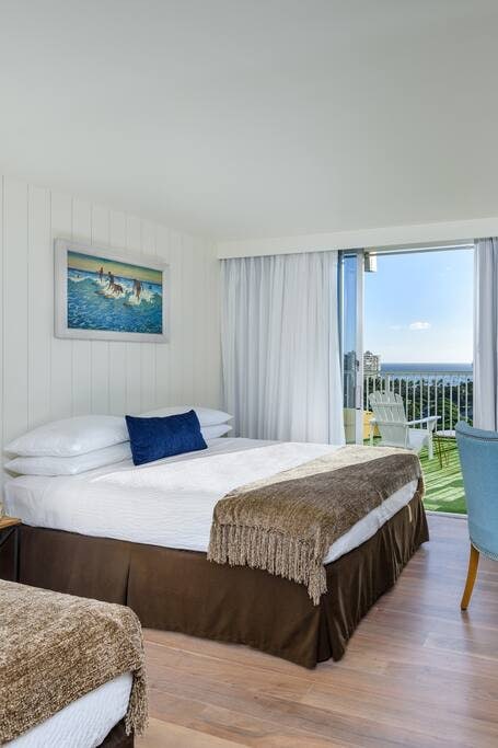 Relájate como la realeza en las comodidades de una cama tamaño king. Rediseñada cuidadosamente con un toque moderno de mediados de siglo, cada habitación cuenta con hermosas vistas de Waikiki. Además de aire acondicionado y wifi, los huéspedes disfrutarán de varias comodidades en la habitación. Mantente activo con el equipo de entrenamiento en la habitación o disfruta de un día en la arena con nuestros elementos básicos para la playa. Más detalles a continuación. Ten en cuenta que, como se indica en las Reglas de la casa, tenemos un depósito reembolsable de $100 por estadía.