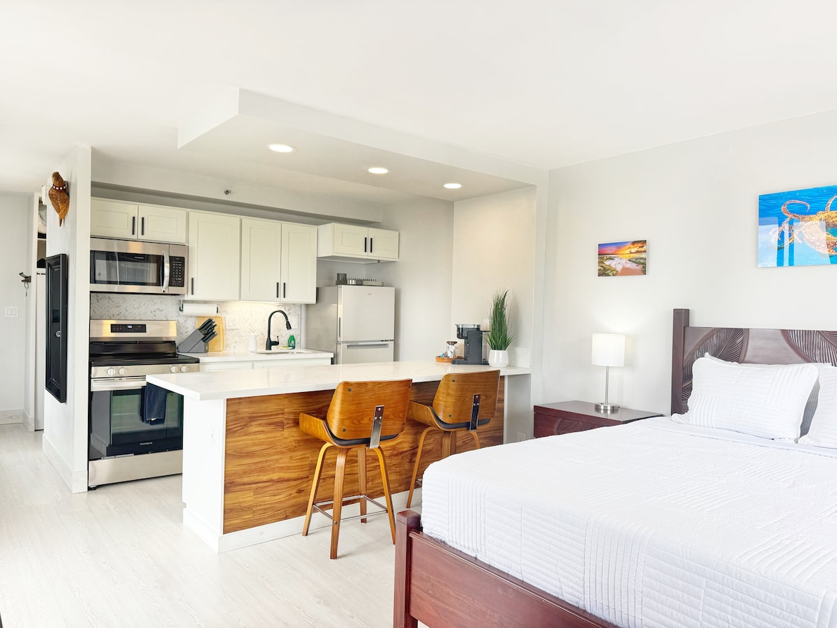 Disfruta de una suite tipo King acogedora y bellamente renovada en el corazón de Waikiki. Con una ubicación céntrica a pocos minutos de la mundialmente famosa playa de Waikiki, plazas comerciales y restaurantes de alta cocina. Totalmente amueblado con una decoración elegante y contemporánea, diseñada para el viajero moderno. Este apartamento está equipado con una gran cama tamaño king y un sofá cama doble, perfecto para parejas y grupos pequeños.