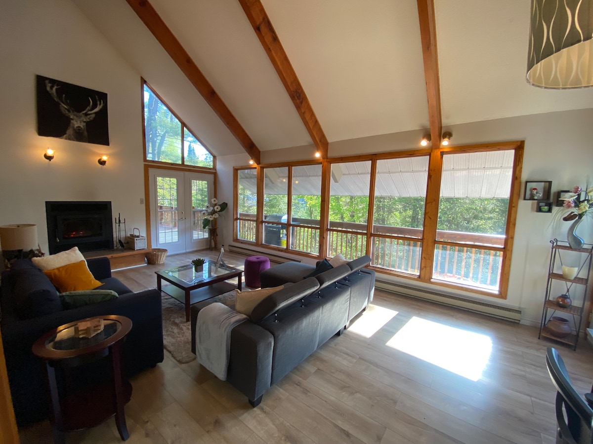 Bienvenido a nuestra casa de campo frente al mar ubicada en una zona tranquila de Wakefield en una propiedad de 2 acres. La casa de campo de dos niveles y 1800 pies cuadrados ha sido cuidadosamente diseñada para integrarse con la naturaleza con grandes ventanales del suelo al techo en todas partes. Ven a relajarte y recargar las pilas en la naturaleza. Hay muchas actividades que hacer: nadar desde el muelle, piragüismo/kayak, pesca, ciclismo, golf, esquí, explorar el parque Gatineau, el Nordik Spa, etc. (CITQ#304057. Pagamos todos los impuestos sobre las ventas y la renta a los gobiernos provinciales/federales)