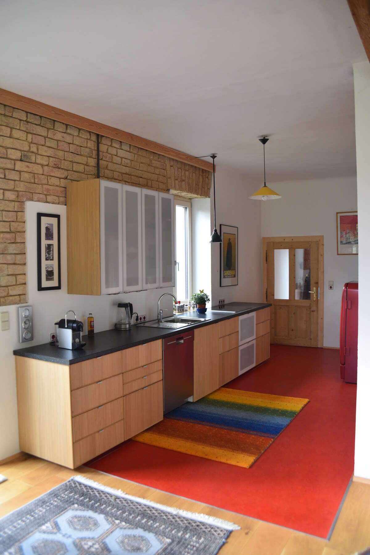Dingelberghof offers tranquility and relaxation, where deer often wander into the open garden. Despite the peaceful setting, it’s just one hour from Vienna Central Station, with good rail and road connections. The 130 sqm guest suite has a romantic courtyard on one side and a private garden with a sauna and shower on the other. The 16th-century walls, with vaulted ceilings in the kitchen and bathroom, create a unique atmosphere.