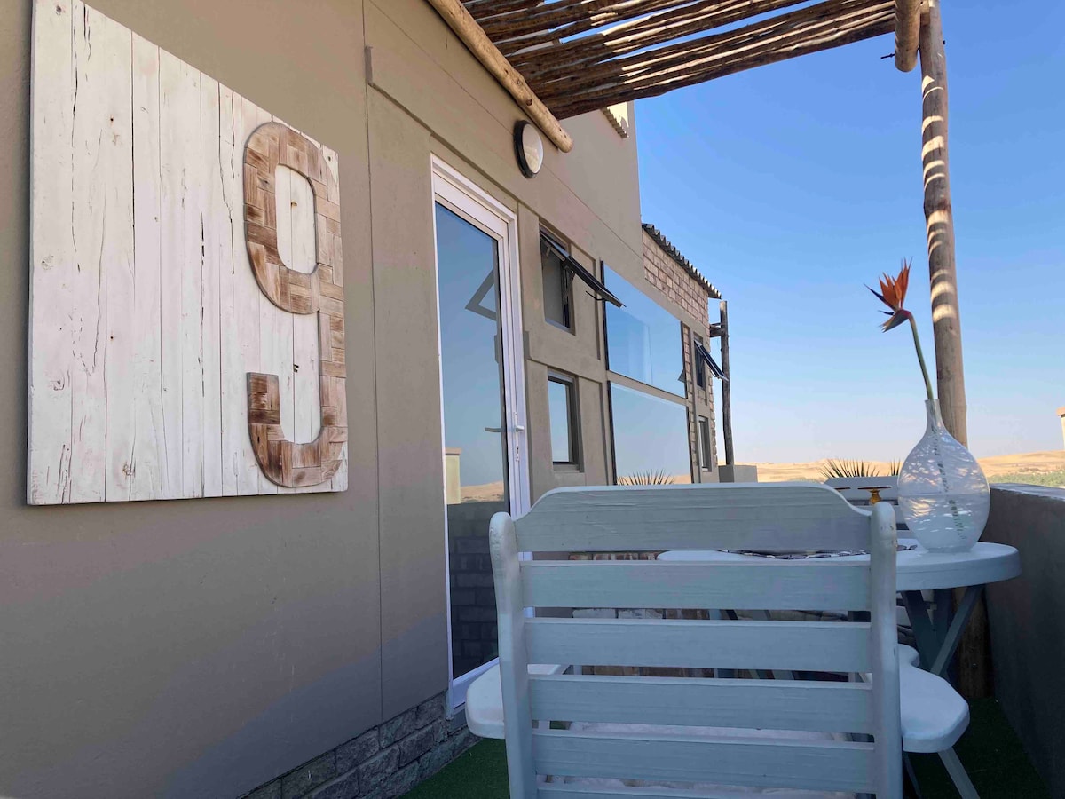 Un apartamento tipo estudio luminoso y de planta abierta con unas vistas preciosas del desierto del Namib y el océano Atlántico y un porche precioso. Situado justo en el desierto del Namib y el río Swakopmund, ¡el apartamento está a solo 5 minutos a pie de las dunas! ¡Cuna bajo petición para los pequeños viajeros! Totalmente equipado con placa de inducción (placa calefactora), microondas, hervidor de agua, cafetera Nespresso y nevera (con algunas delicias como leche y huevos).