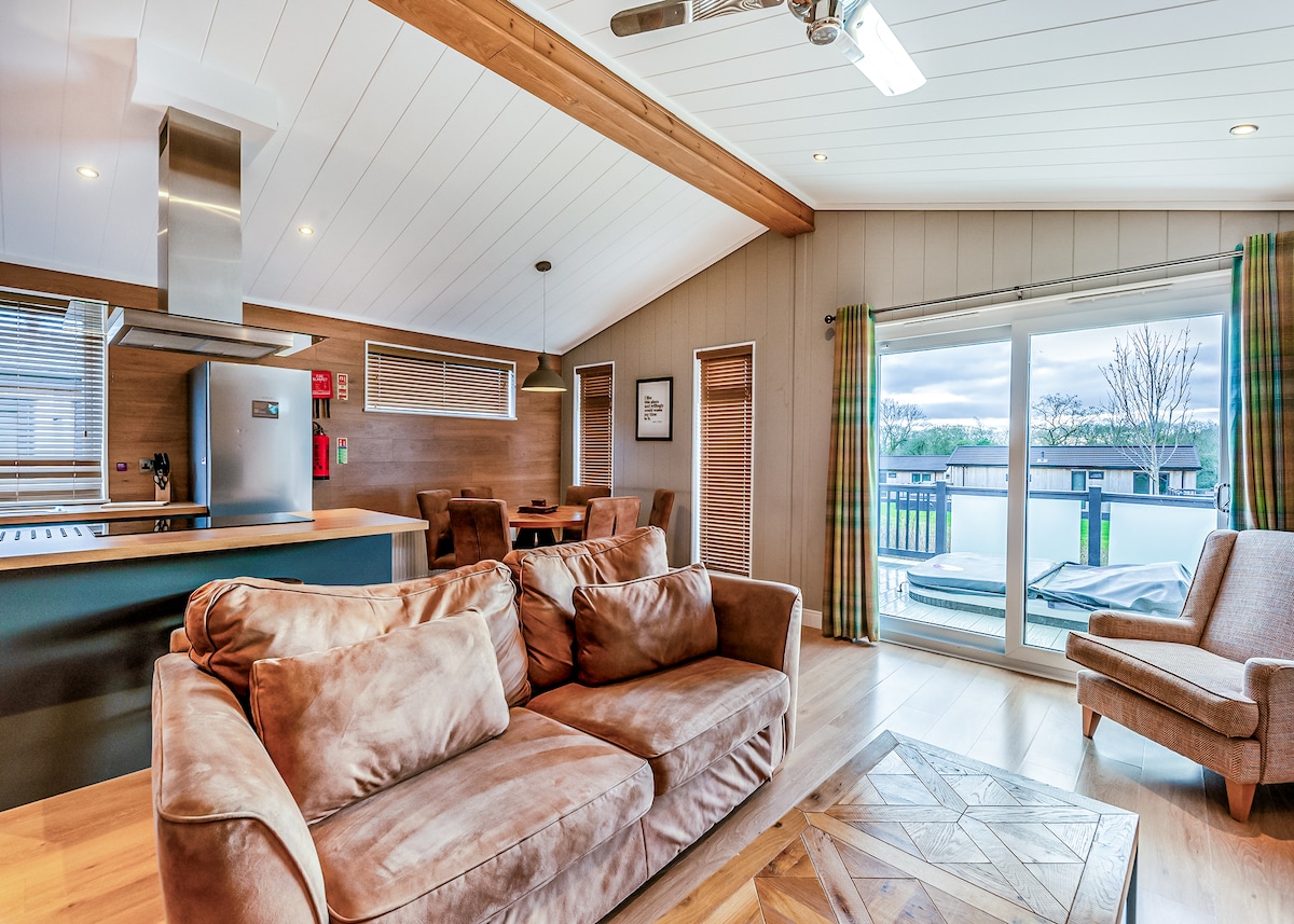 The Ettington Lodge Premier is a luxury lodge with everything you need for a romantic break away, the open-plan living area has a fully equipped kitchen with cosy seating area.