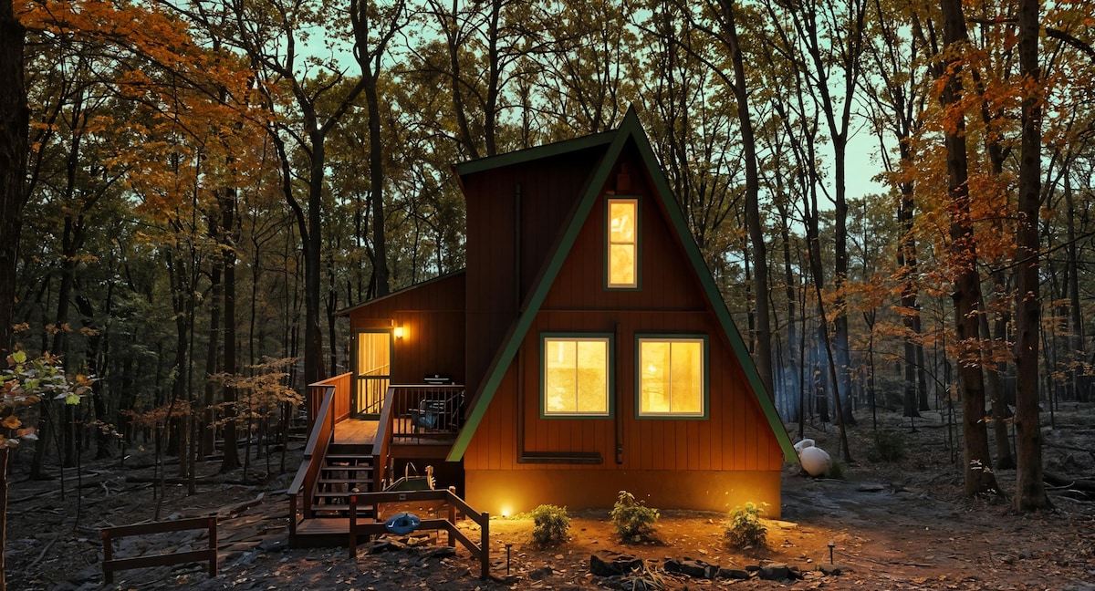 Experimenta el epítome del lujo en nuestra impresionante cabaña con estructura en A, ubicada en medio de los serenos bosques. Este moderno refugio ofrece lujosas comodidades y una impresionante sala de estar abierta con ventanas del suelo al techo, que te sumergen en la belleza de la naturaleza. Disfruta del jacuzzi privado, relájate junto a la hoguera y da rienda suelta a tus habilidades culinarias en nuestra cocina totalmente equipada. El gran porche cubierto ofrece un oasis tranquilo, mientras que las rutas de senderismo cercanas, los campos de golf y un spa ofrecen una escapada inolvidable.