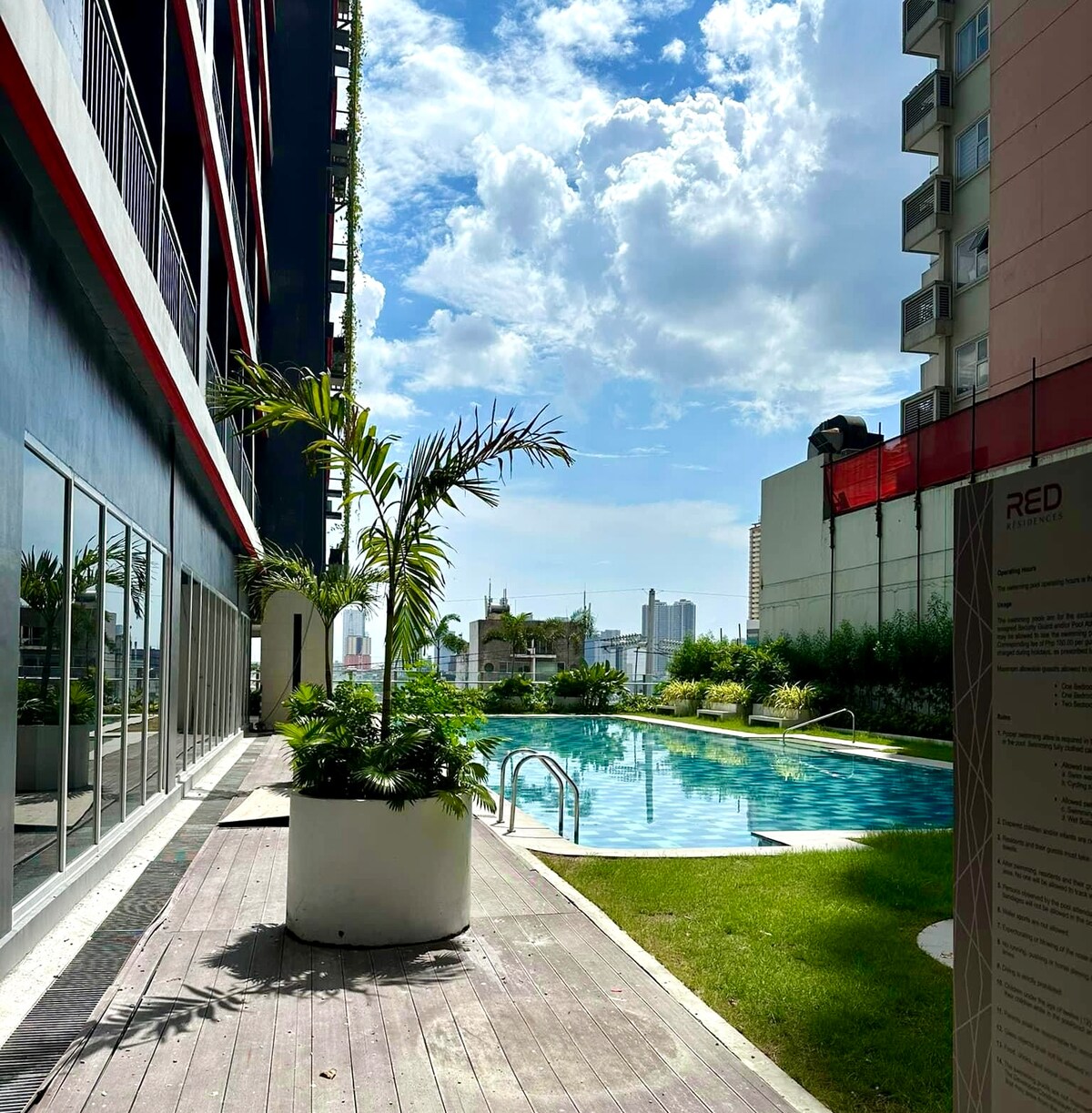 ¡Este es un mini resort vacacional en la ciudad! Disfruta de una estancia relajante en esta habitación con vistas a la piscina. Tu familia puede nadar y estrechar lazos en este maravilloso espacio. Tiene una cama tamaño queen, una cama doble y un sofá cama. Esta unidad está equipada con cocina, comedor y baño. Esta unidad se encuentra en el CBD Makati, cerca de los centros comerciales Greenbelt. Restaurantes, bares, bancos, tiendas de conveniencia, farmacia y cafeterías están al alcance de la mano. El parque también se encuentra a lo largo de la calle Gamboa.