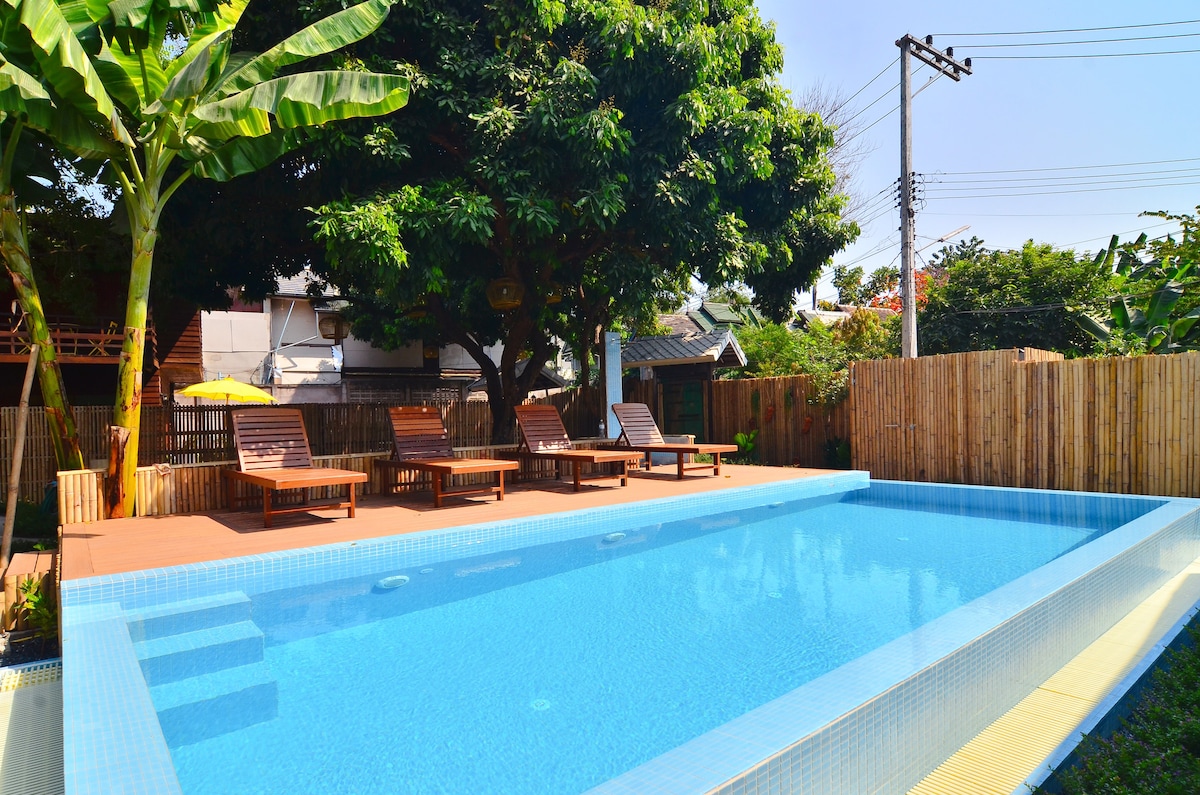 Nuestra encantadora casa es semi-de madera con 3 dormitorios con aire acondicionado y 3 baños. Está equipada con cocina, bar, wifi de fibra óptica y un gran espacio abierto en la planta superior. Es perfecta para una familia con niños o un grupo de amigos. Estamos a 10 minutos a pie de la Puerta de Chiang Mai y de la calle peatonal del sábado. Ofrecemos desayuno casero gratuito todas las mañanas y servicio de recogida gratuito desde el aeropuerto.