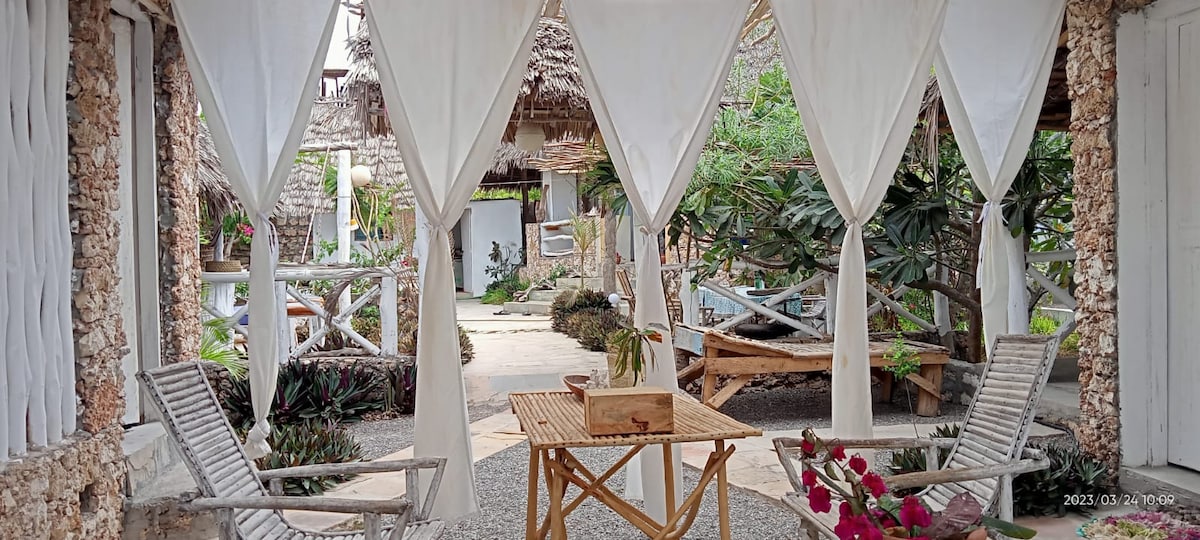 This charming, one-of-a-kind place is located just 5 mins walk from Jacaranda beach, 7kms north of Watamu. Kijiwe Villas consists of 2 double bedrooms downstairs, one room with 2 double beds and living room upstairs and a one-bedroom cottage. All rooms are en-suite. Set in a large lush garden with lots of outdoor seating. A perfect place to relax for a romantic getaway or enjoy with a group of friends. We also own a wonderful beach restaurant where you can enjoy a free sun bed.