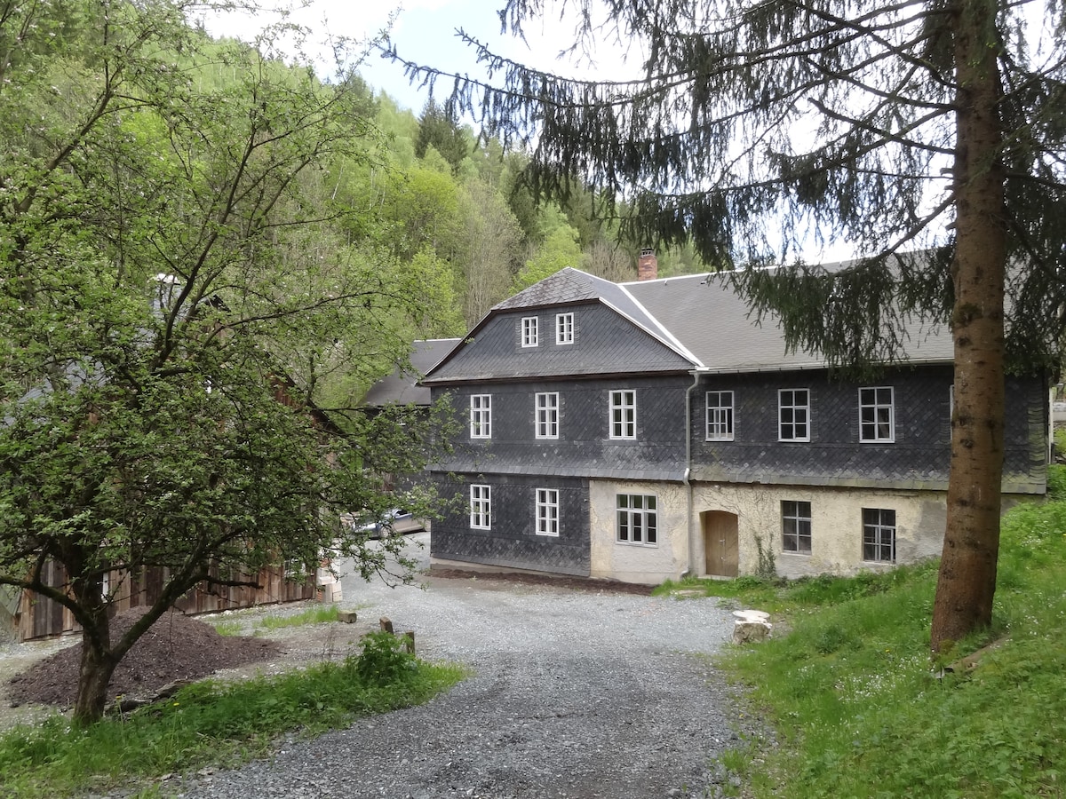 Alleinliegende verschieferte Mühle mit Gesindehaus und Scheune an einem kleinen Bächlein neben riesiger Lichtung unweit Kronach. In den letzten drei Jahren sorgfältig renoviert, ausschließlich mit alten Möbeln eingerichtet, böhmischer Kreuzgewölbestall zu 80 qm großer Wohnküche umgebaut. Brotbackofen, Kastenfenster, Zentralheizung. Schmetterlinge ohne Ende, Glühwürmchen, der Schwarzstorch ... Zusammen mit dem direkt daneben liegendem, neu renovierten Gesindehaus haben über 22 Personen Platz.