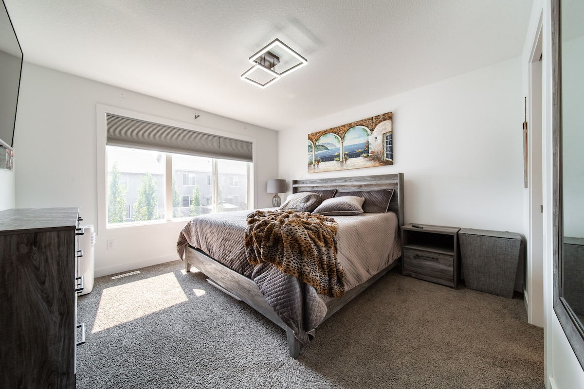 Esta espaciosa suite de lujo 3BR/2.5BA en la planta superior con jacuzzi se encuentra en la zona de Grandville, cerca del centro comercial West Edmonton (WEM - 10 minutos en auto) con cama tamaño king, queen y cama doble/doble en los dormitorios, y cómodos sofás cama en la sala de estar. Excelentes comodidades, como lavadora/secadora, electrodomésticos de cocina y utensilios de cocina, espacio de oficina, TV de 50 pulgadas con Netflix, YouTube en la sala de estar. Nuestra casa totalmente privada es ideal para parejas, aventureros solitarios, viajeros de negocios y familias (con hijos). NO HAY FIESTAS 🎊 EN ABSOLUTO