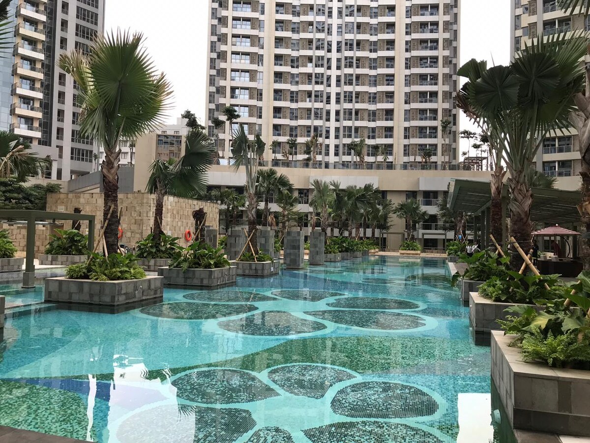 Un lujoso apartamento de 1 dormitorio totalmente amueblado con una cama tamaño king, ubicado en Pantai Indah Kapuk (Gold Coast Apartment Honolulu Tower) con vistas a los manglares. Este apartamento está equipado con elementos básicos de cocina, TV inteligente con Youtube y Netflix y acceso a servicios como: piscina al aire libre e interior, pista de footing, gimnasio y sauna. Los servicios de lavandería y las tiendas de comestibles se encuentran cerca del vestíbulo del apartamento. Nota: Se proporciona una cuenta de Netflix.