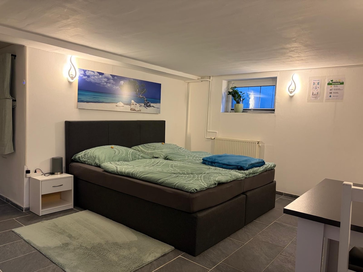 Komplett neu renovierte & möblierte 22Qm/ 1 Zimmer Wohnung. Es gibt einen eigenen Zugang, zur Souterrain-Wohnung. Die Deckenhöhe ist ca 195 cm. Dazu gibt es eine kleine Küche, mit Ceranfeld, ein Spülbecken und eine Kühl/Gefrierkombi. Die Küche ist voll ausgestattet. Eine separate Toilette mit Waschbecken und Fön gehört auch zur Wohnung, sowie eine Dusche.Ein Fernseher, Kommoden, Esstisch mit 2 Stühlen dazu. Ein großes Boxspringbett gehört auch zur Ausstattung. Wir wünschen euch schöne Ferien