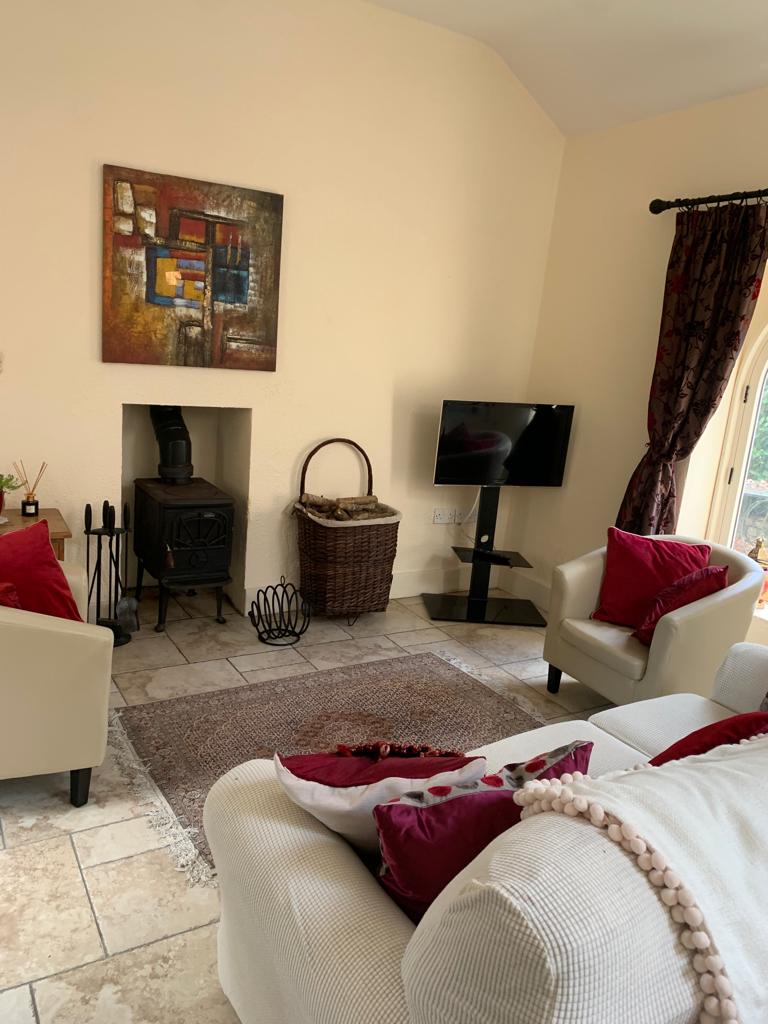 A beautiful traditional stone built barn converted into a contemporary/industrial/rustic living space with quirky touches. Located in the idyllic foothills of the Wicklow Mountains, on the Wicklow Way, it features an open plan kitchen/living/dining space, a mezzanine bedroom and a spacious wet room. An extension offers an additional boot room/rustic bathroom/loo and paved courtyard. The grounds are comprised of upper and lower lawns set on half an acre. A country pub is within walking distance.