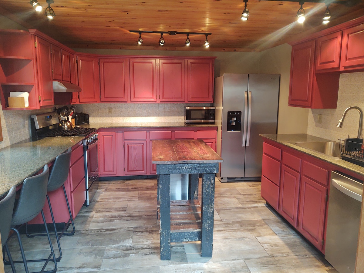 ¡Te damos la bienvenida a Doe-A-Deer Lodge en Jay NY! ¡Ven y quédate en esta hermosa casa de pino nudoso de 6 dormitorios y 3 baños en las Adirondacks! Después de un día de exploración, vuelve a este tranquilo refugio y relájate en la increíble habitación de dos pisos con calefacción por suelo radiante debajo de tus pies. Hemos actualizado con electrodomésticos de acero inoxidable nuevos, encimeras de granito, suelo de baldosas, alfombra, un gran sofá de cuero y un televisor de pantalla plana. Lo tenemos todo: ¡wifi, cable, juegos y mucho más! ¡Entorno privado también!