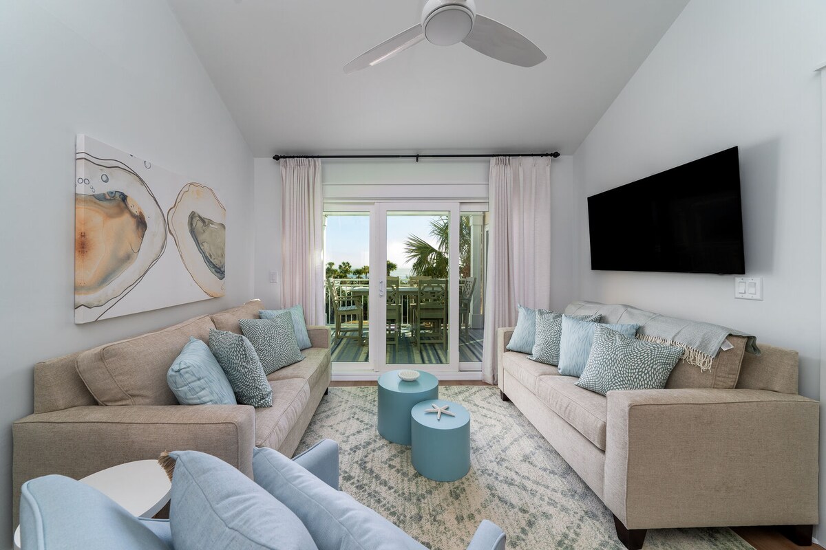 Disfruta de esta espaciosa villa en el segundo piso con un dormitorio grande y una habitación adicional que se puede utilizar como segundo dormitorio o espacio de trabajo. Las amplias ventanas del comedor ofrecen vistas a la laguna y a los robles vivos. La cocina está totalmente equipada con electrodomésticos de acero inoxidable nuevos; el baño está reformado con buen gusto. Se proporcionan sillas de playa, sombrillas y toallas. Wifi y televisores inteligentes de pantalla plana en todas partes. El amplio dormitorio y la sala de estar te invitan a relajarte después de pasar el día en la playa, la cancha de tenis o el campo de golf.