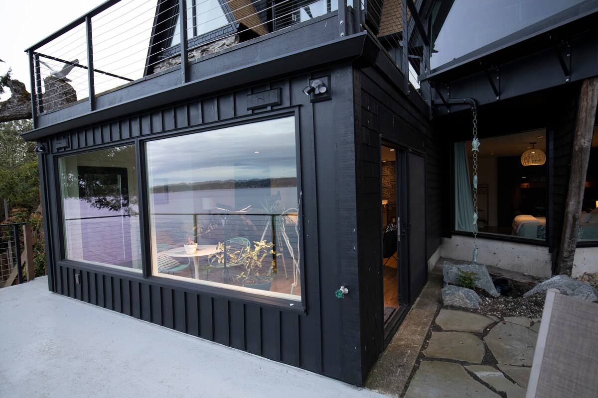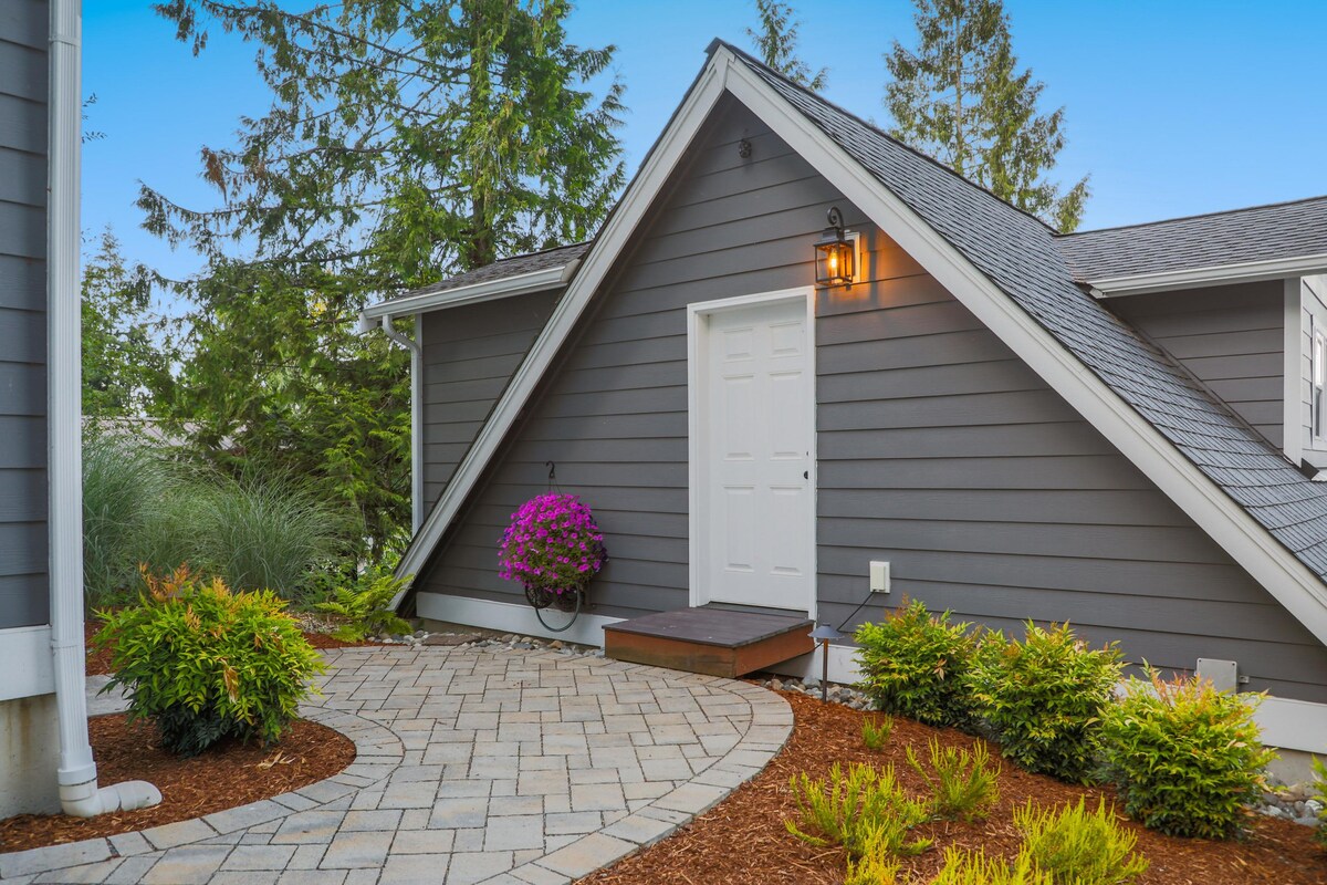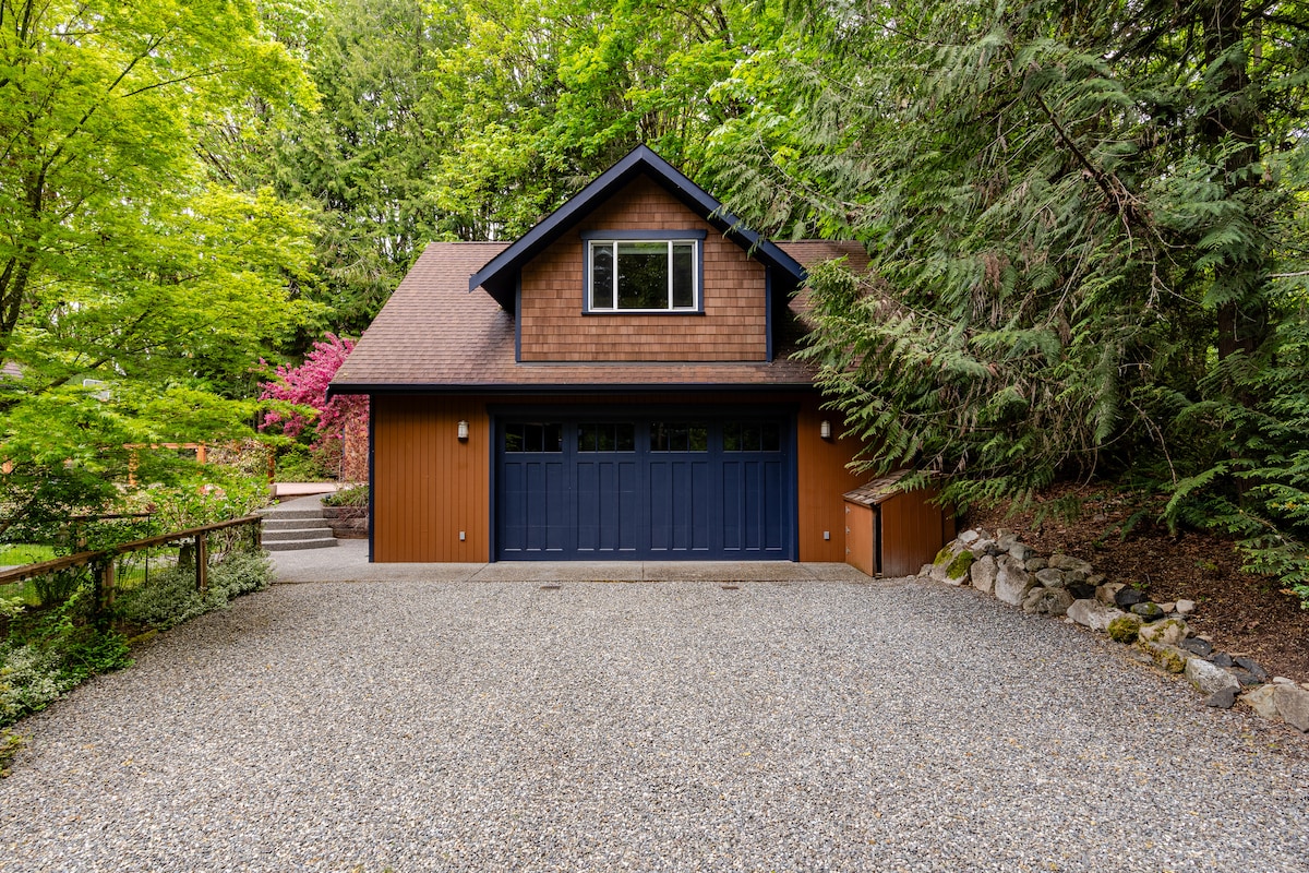 Casa de huéspedes aislada, luminosa y moderna con vistas completas al jardín, a 5 minutos de la autopista y a 10 minutos del ferry en el oeste de Bremerton. El espacio es una unidad independiente separada de nuestra casa principal escondida de la calle principal, enclavada entre los cedros y abetos a lo largo de Mud Bay que conecta con Puget Sound. La habitación tiene una vista completa de 270 grados de los jardines y árboles, cama tamaño queen murphy, nevera, fregadero, microondas, estufa de leña y baño, completo con ducha de lluvia al aire libre de 16 pulgadas.