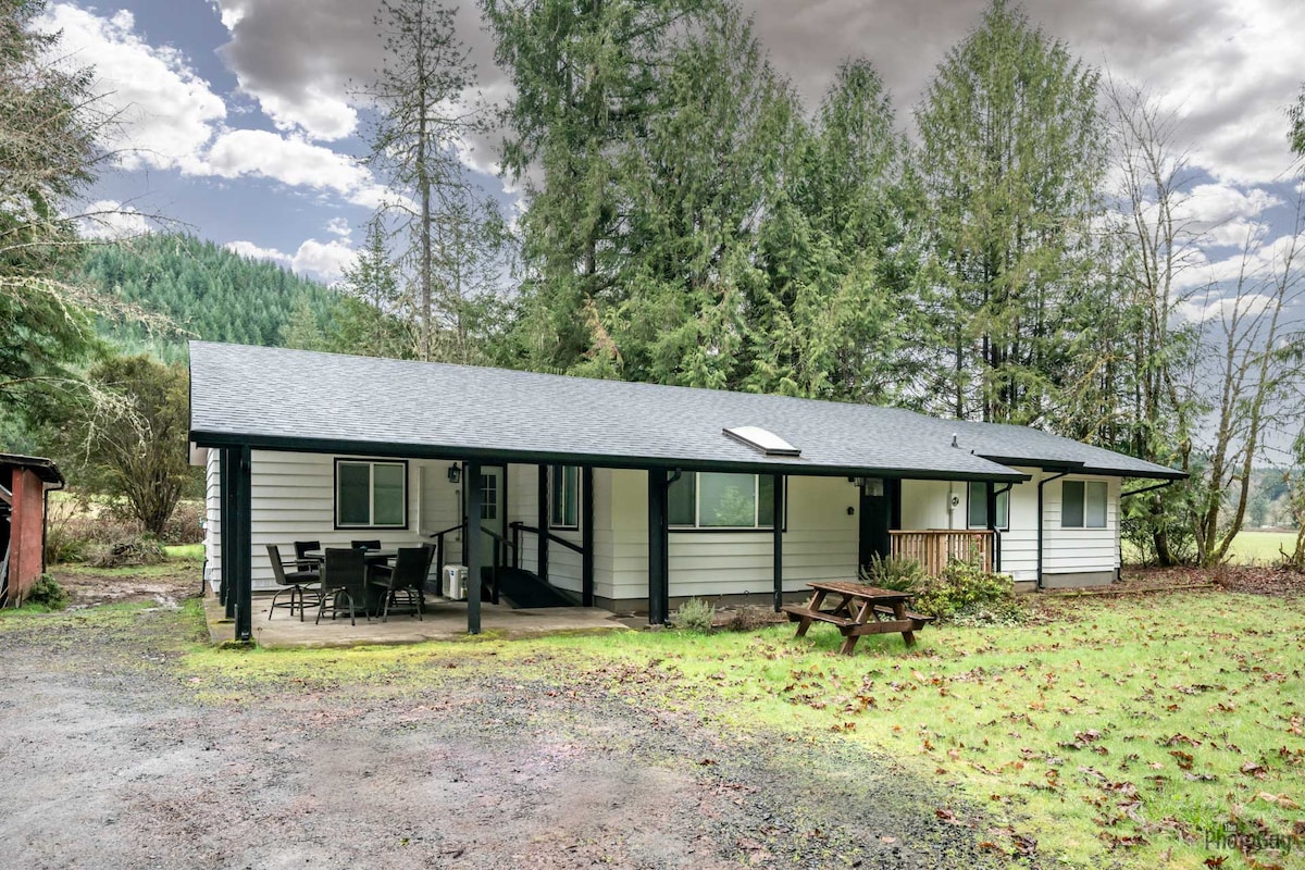 ¡Este bungalow elegante y único se encuentra en 4 acres de terreno aislado (sin vecinos)! Tu acceso privado al río (con playa de arena) es el lugar perfecto para hacer una fogata, beber tu café por la mañana o descansar al sol. Independientemente de la temporada, tú y tus invitados disfrutaréis del gran porche con impresionantes vistas al monte Hood, el río Salmon, todo en un entorno de parque. El lugar perfecto para retirarte, relajarte y crear recuerdos que nunca olvidarás. No se permiten eventos a menos que se confirmen con el anfitrión.