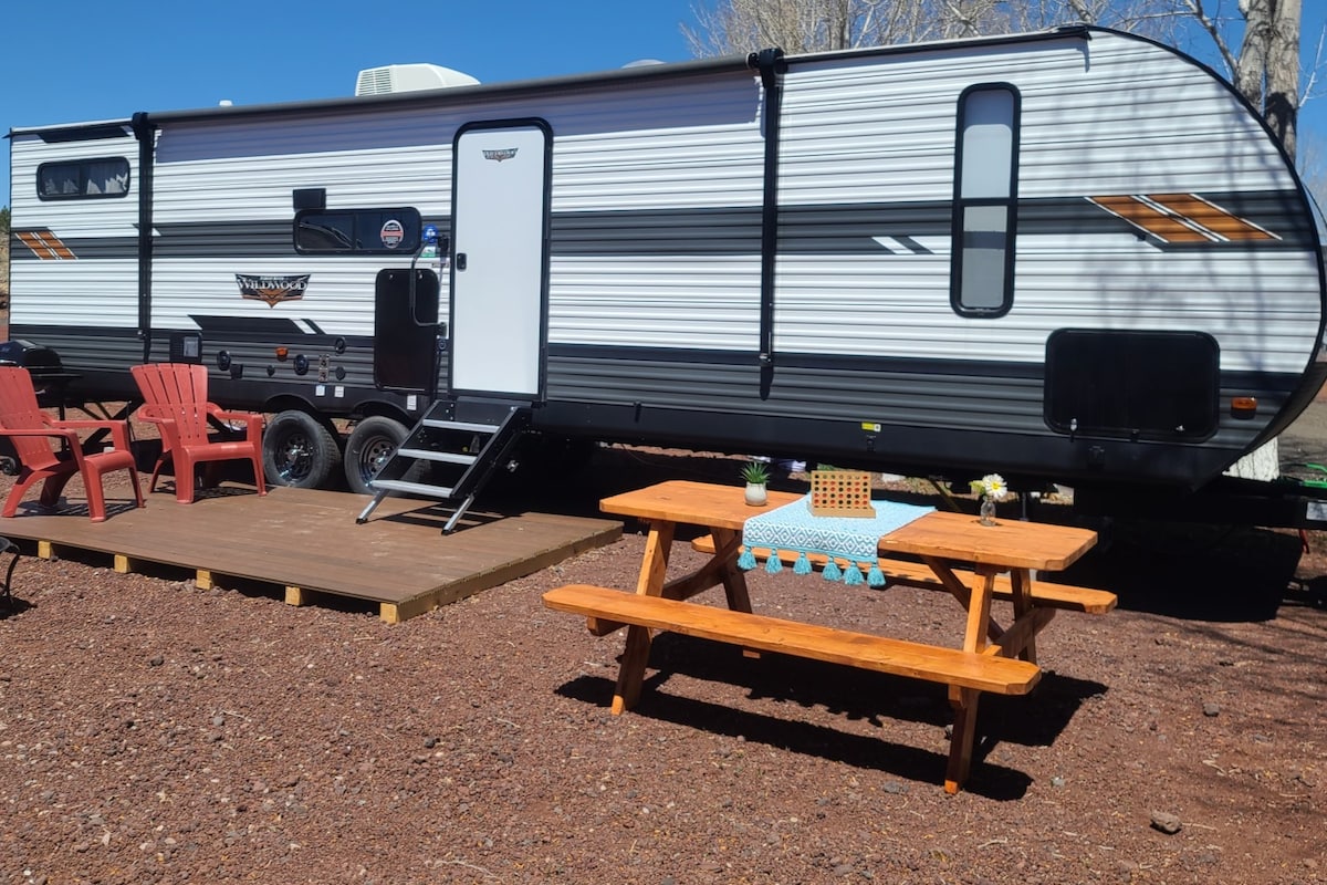 ¡Te damos la bienvenida a nuestra mini-unidad #2! Tu lujosa experiencia de glamping en la autocaravana del Gran Cañón te espera. Estamos ubicados en la ciudad de Williams, Arizona. La "Puerta del Gran Cañón" y la ubicación del ferrocarril del Gran Cañón. ¡Estamos a 54 millas en auto del Gran Cañón y nos preparamos para cualquier temporada! Trae a tus amigos y familiares para experimentar el aire libre con estilo en nuestro Boutique Glamping Resort. Este es un 1 dormitorio Queen, 1 sofá cama y 2 literas. ¡¡Explora la Ruta 66!!