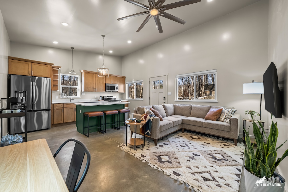 Kick back and relax in this calm, stylish space with hot tub. Secluded and next to creek. Light up the linear gas fireplace and watch your favorite movies on the Roku smart TV in the living room. Cook your favorite meal in the fully stocked kitchen with eat in bar. Dining room seats 6. Bedroom with king bed & walk-in closet. Deep tub & shower combo, lighted mirror. Dedicated work space in living room with desk and office chair.