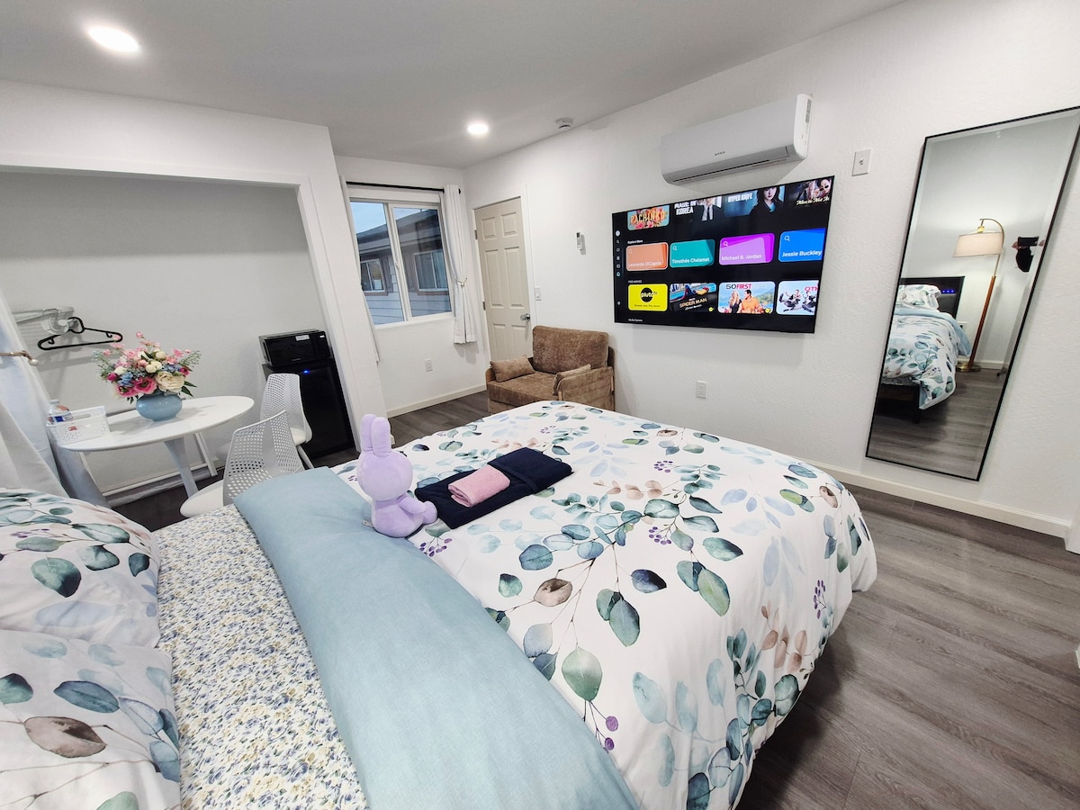 Nuestra casa de huéspedes independiente está situada en el centro de DTSJ, cerca de Japantown, cuenta con una cama tamaño king ultracómoda y un sistema de aire acondicionado frío mini split en el dormitorio que garantiza una noche de sueño reparador. Una cocina totalmente equipada para chefs y para aquellos que necesitan trabajar durante su estancia, un escritorio ergonómico automático para sentarse y estar de pie. El oasis al aire libre incluye un enorme televisor inteligente de 65 pulgadas, iluminación ambiental, ventilador de techo al aire libre, chimenea de propano y zona de comedor y descanso. El aparcamiento en la calle es gratuito y amplio.