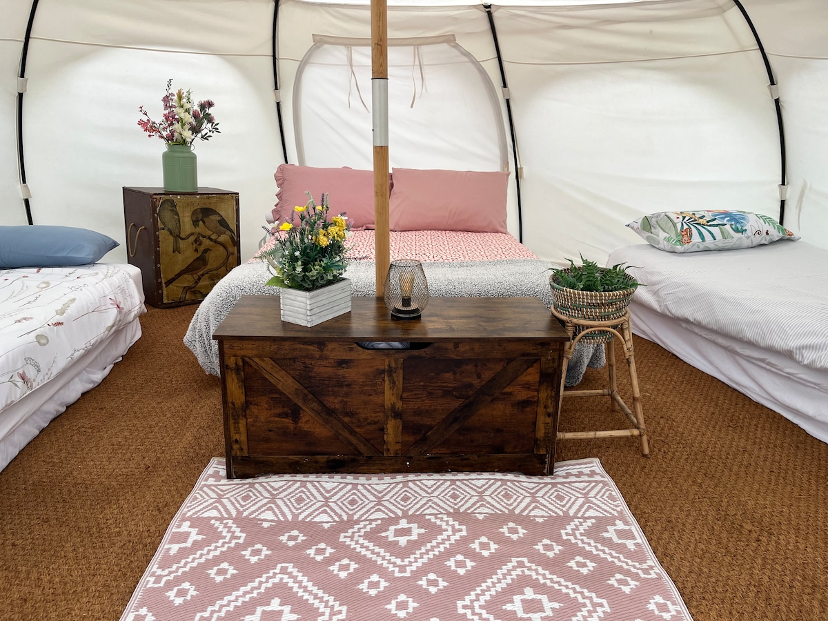 Whether you seek a romantic getaway or a tranquil retreat, our adult camping experience blends comfort with the great outdoors allowing you to unwind under the open sky and reconnect with the rhythm of nature. You may be under canvas, but we can assure you - out bell tents are like home from home. With a double bed, rugs, cushions and throws, you’ll be warm and comfy. There is a firepit and BBQ just outside of the Bell Tent so you will be able to kick back, cook food and stay toasty.