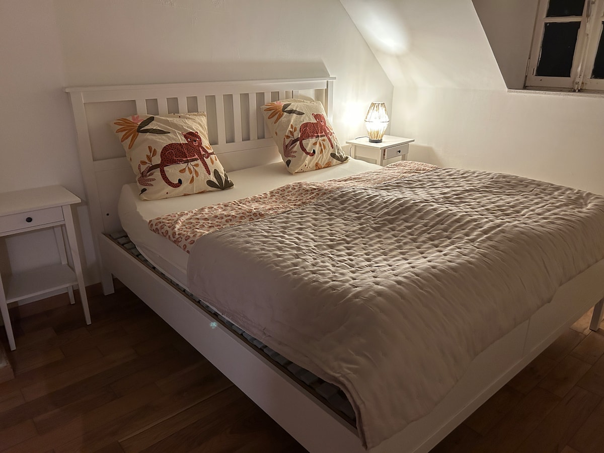 Apartamento en pleno campo, encontrará: 2 habitaciones (2 camas 160/200) 1 cocina equipada con nevera, horno, microondas, lavavajillas, cafetera, tostadora, hervidor de agua, raclette, exprimidor, batidora. 1 salón con sofá cama, comedor 1 aseo 1 baño con ducha, lavabo, lavadora Terraza y jardín con barbacoa Tiene a su disposición sábanas y toallas de baño. Libros, juegos de mesa y juegos para niños están disponibles para pasar un rato agradable.