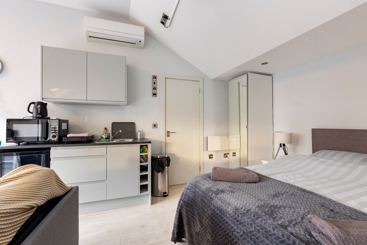 Hermoso edificio de estudio independiente con jardín en una calle residencial en Wimbledon Park, SW19. El edificio tiene acceso privado a través de una puerta lateral. Hay una cama doble tamaño queen que también se puede dividir en dos camas individuales. El sofá se convierte en una litera adecuada para 2 niños. Moderna ducha. Amplia sala de estar con TV, escritorio/mesa de comedor. Estación de tren de superficie de Earlsfield a 8 minutos a pie, con trenes a London Waterloo en 11 minutos. Metro de Wimbledon Park en la línea District a 10 minutos a pie.