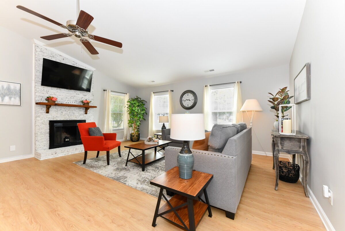 Escape to our fully renovated 7-bed, 4.5-bath Jamestown retreat, perfect for up to 21 guests. Ideal for large families, groups, and corporate stays, sports groups, this spacious home features a game room, screened porch with ping-pong, and a chef’s kitchen on a private half-acre lot. Walk to downtown Jamestown restaurants, bakery, brewery, nightlife, and shopping. 7 mi to HP Market, 4 mi to Sedgefield CC, 10 mi to GSO Coliseum/Aquatic Center, 5 mi to HPU, 10 mi to UNCG, and 12 mi to PTI Airport.