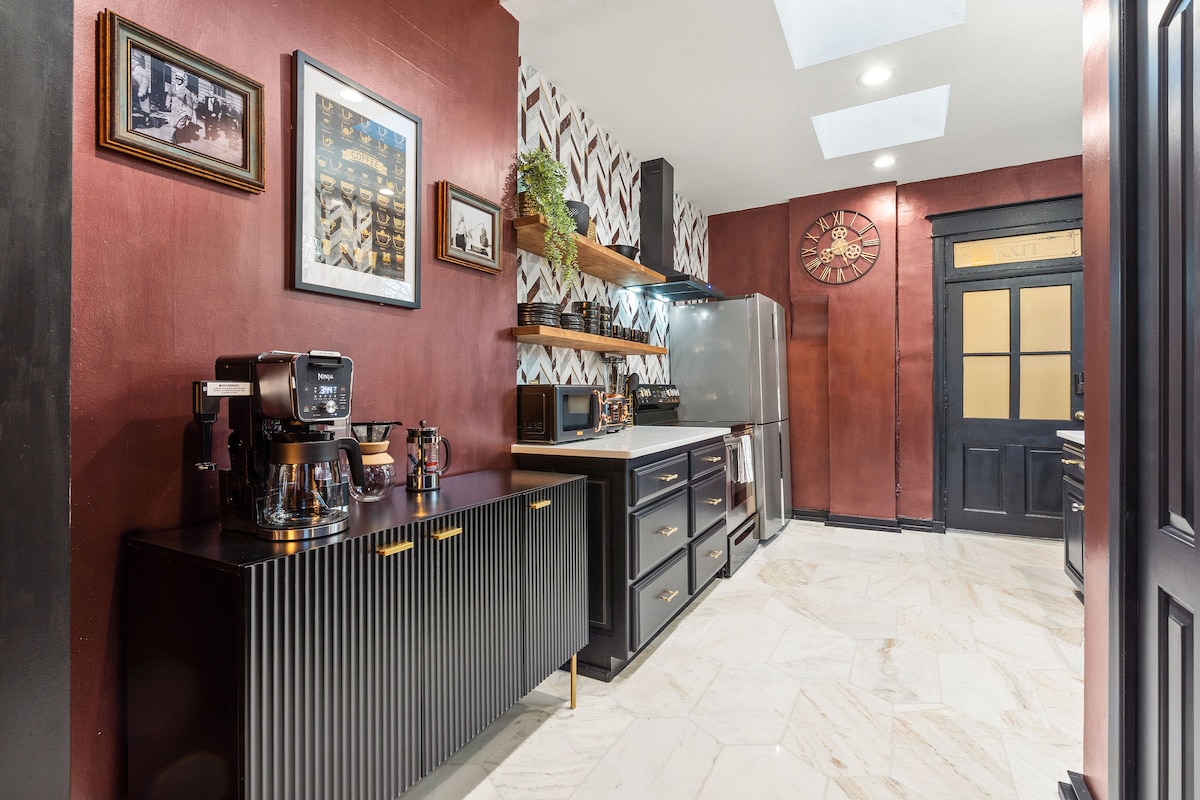 El glamour de👑 lujo de 1800 con candelabros, detalles dorados y cortinas de terciopelo Nivel 👑 superior de dúplex histórico en MidtownKC 👑 ¡A poca distancia del Uptown Theatre y de la nueva parada de tranvía de Main Street! 👑 A minutos de Westport y de la vida nocturna del centro de KC 👑 Capacidad para 4 personas con 2 dormitorios con cama tamaño «king» y 1 baño completo con azulejos de mármol Cocina 👑 totalmente equipada, comedor para 6 personas y cafetería mejorada Espacio de oficina👑 privado con wifi de alta velocidad para trabajar a distancia 👑 Lavadora/secadora en la unidad + productos de baño de lujo incluidos