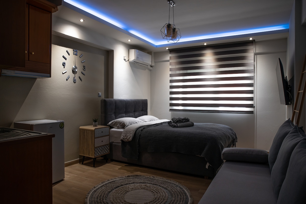Excelente estudio de una habitación (en la planta baja y sin balcón) a solo 10 minutos a pie de la plaza central de Xanthi. Hay una cama doble grande (1,60 x 2,00) con colchón anatómico. El apartamento se calienta exclusivamente con aire acondicionado.