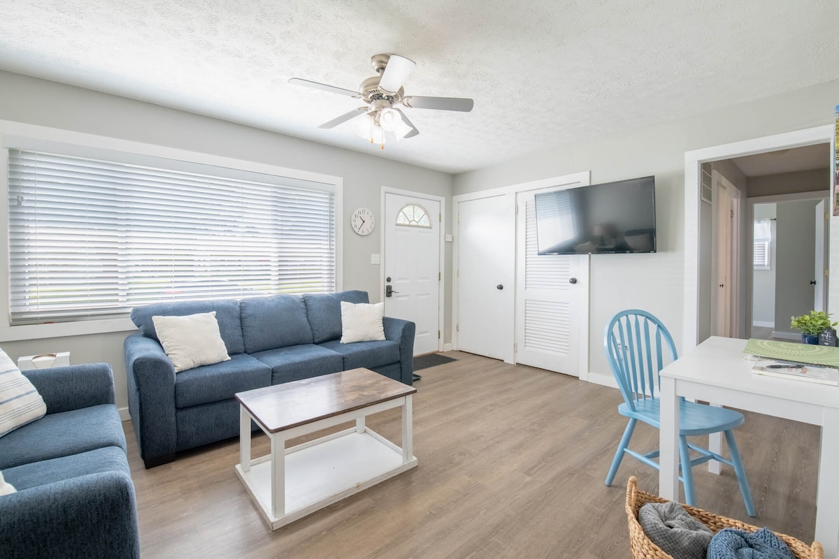 Este apartamento es un gemelo de nuestro Airbnb «Pilot Lounge» situado al otro lado del pasillo. Dos adultos pueden dormir en un dormitorio dedicado en una cama tamaño queen mientras que el tercer huésped duerme en una cama plegable doble. La cocina está equipada para cocinar de forma básica con nevera, Keurig, horno, microondas y tostadora, además de vajilla. Hay un televisor de 42pulgadas emparejado con un Apple TV cargado con varias aplicaciones. Alexa proporciona información y control de luz. El aire acondicionado de dos ventanas mantiene el lugar fresco. Hay aparcamiento gratuito en el aparcamiento público adyacente.