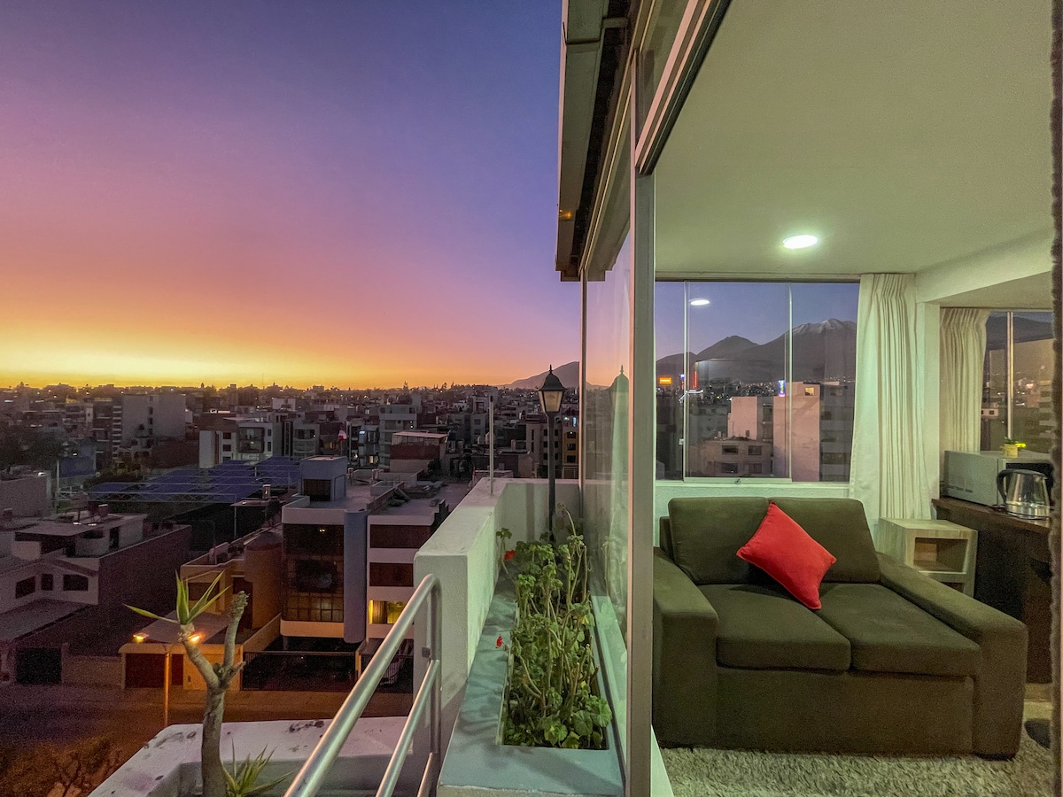 Enjoy your stay in the White City in a comfortable and bright studio just a 15-minute walk from the historic center. Ideal for enjoying Arequipa's sunny days, with views of the volcanoes from the balcony. The studio is equipped with all basic appliances. It includes a private bathroom, 24-hour hot water, and internet connection. The building features an elevator, an internal patio, and a portal with video surveillance.