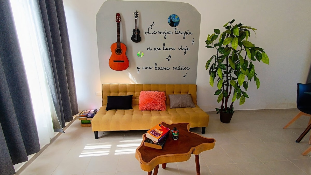 Disfruta de un espacio acogedor, tranquilo. Perfecto para parejas, viajeros de negocios o viajes de descanso. 1 amplia recámara con: *Smart Tv ( Netflix) *Aire acondicionado inverter. *Closet *Cama king Sala y comedor -Cocina equipada para preparar tus comidas con: parrilla eléctrica, refrigerador, microondas, cafetera, airfryer. Baño completo con agua caliente. Adicionales: -Estacionamiento. -Jardín delantero y trasero con grava Llegada autónoma con cerradura inteligente