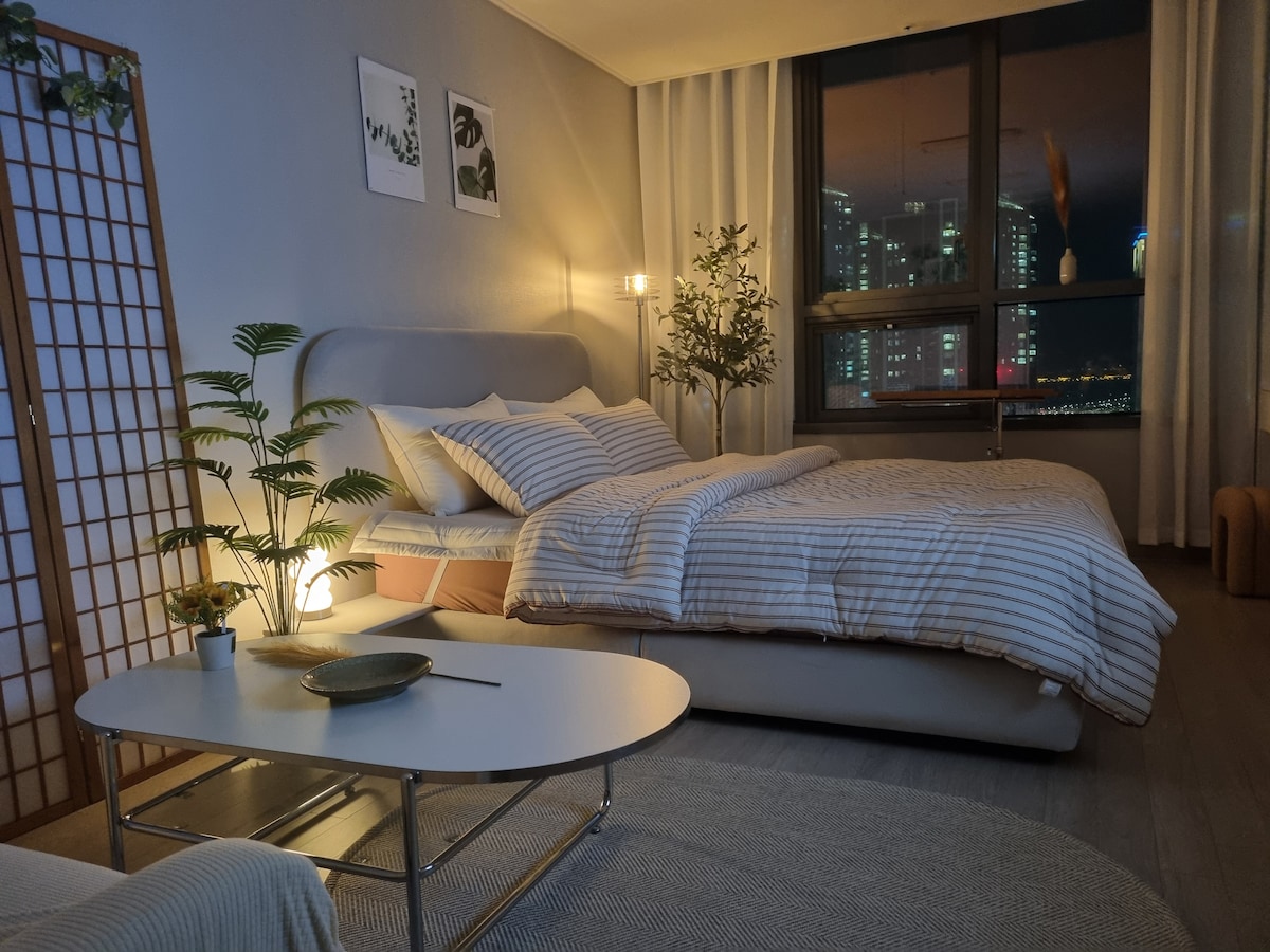Nuevo * Momo * 《Cama King Size》 A 5 minutos de la estación del Parque del Festival de la Luz de Songdo/Netflix/Vista al mar/Viaje de negocios/Estancia larga