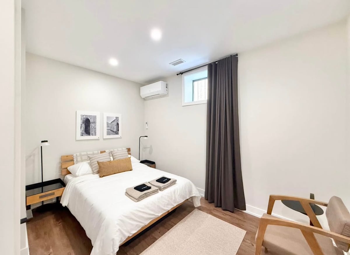 Moderna suite de 1 dormitorio en el sótano con entrada privada, cocina completa, baño elegante y acogedora sala de estar. Disfruta de lavandería en la suite, wifi de alta velocidad, Smart TV para streaming, aparcamiento gratuito y un cómodo dormitorio diseñado para una estancia tranquila. Con su diseño luminoso y abierto y su ubicación privilegiada cerca del transporte público, disfrutarás de un fácil acceso a las principales atracciones, tiendas y restaurantes. Perfecto para parejas o viajeros de negocios que buscan comodidad, conveniencia y una experiencia de hogar lejos de casa.
