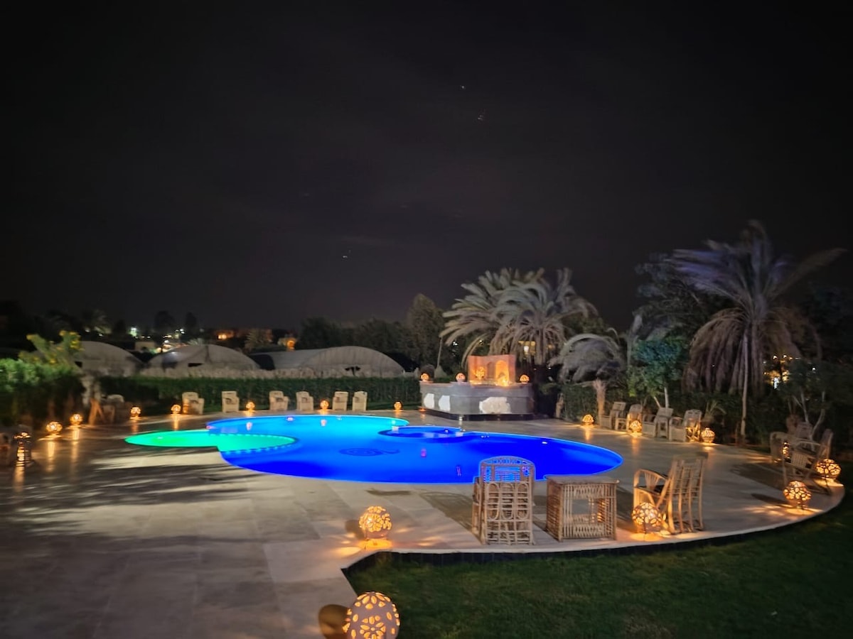 Villa de lujo de 6 dormitorios en Tunis Village, Fayoum, a solo 90 minutos de El Cairo. Interiores elegantes, jardín privado, terrazas con vistas al lago Qarun, wifi rápido y chef privado opcional. Perfecto para familias, grupos y viajeros que buscan un exclusivo refugio ecológico de lujo en Egipto.