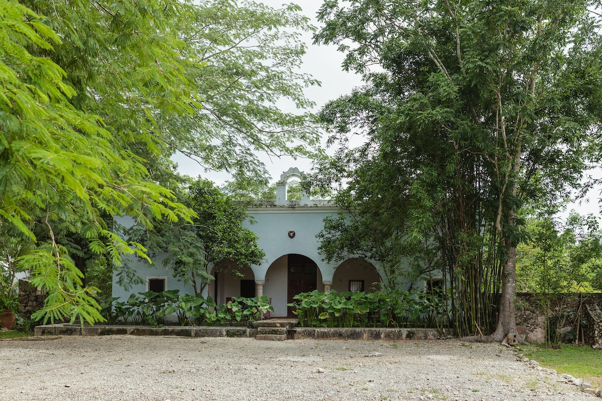 Escapa a Hacienda Cuch Balam — hacienda colonial privada de 2 hectáreas en el campo yucateco. Alquiler completo (full buyout) solo para ti y tu pareja. Te alojarás en Casa Casco (casa principal): 400 m² abiertos con cama king, cocina y sala. Afuera tienes piscina de inmersión (30 m³) y el cenote privado solo para ustedes. Hamacas, terrazas y jardines para total desconexión. Sin WiFi ni señal celular fuerte: experiencia digital detox.
