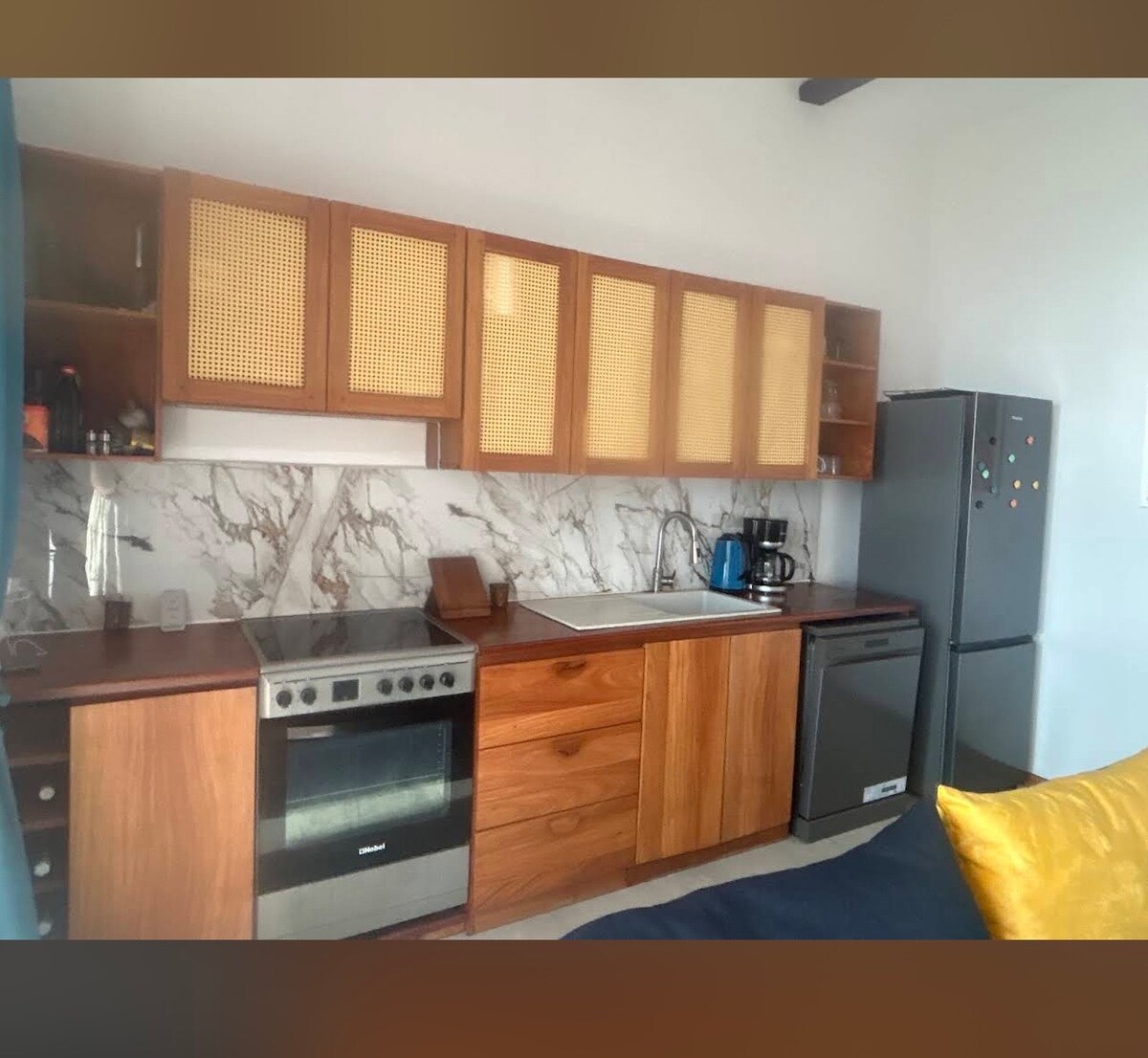 Privado y acogedor, el estudio está situado en el primer piso de una casa de playa, con vistas al mar y entrada privada. Cuenta con una gran terraza con vistas a la playa y al mar, perfecta para disfrutar de una taza de café mientras contemplas el amanecer por la mañana. El dormitorio, el baño con agua caliente y la cocina son privados. Wifi gratuito ilimitado. Hay un restaurante a 2 pasos de la casa y pequeñas tiendas de comestibles a poca distancia a pie. Recogida y traslado al aeropuerto (cargo adicional).