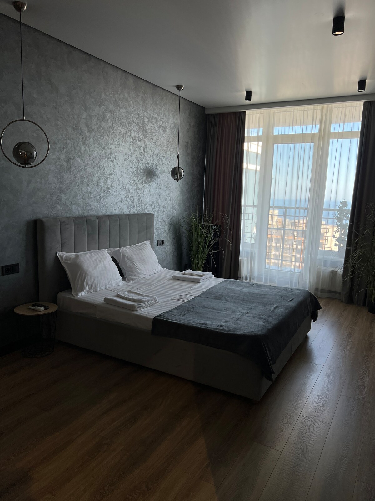 ¡Nuevo apartamento con vistas al mar, a solo 3 minutos de la playa de arena! Dos habitaciones separadas y dos balcones con vistas al mar: un dormitorio con una cama y una cocina-estudio con un sofá cama. El territorio está cerrado y es seguro. Hay una cafetería y un parque infantil. Las tiendas de comestibles y los restaurantes están a poca distancia a pie.