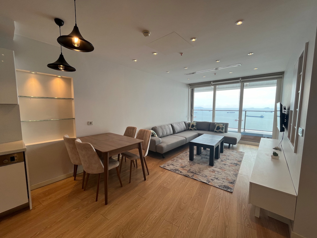 Acerca de este espacio Este lugar único tiene su propio estilo. La propiedad está justo al lado del mar y tiene una hermosa vista única al mar. Puedes disfrutar del atardecer desde el dormitorio y la sala de estar. La propiedad está en el piso 20 y está en la sección central del edificio, con una vista muy amplia y panorámica del mar. Se encuentra a 5 minutos a pie de la línea de metro Marmaray. Hay una parada de taxis. Está a 5 minutos a pie del Fisekhane ( farmacia , mercado, restaurante, etc.).