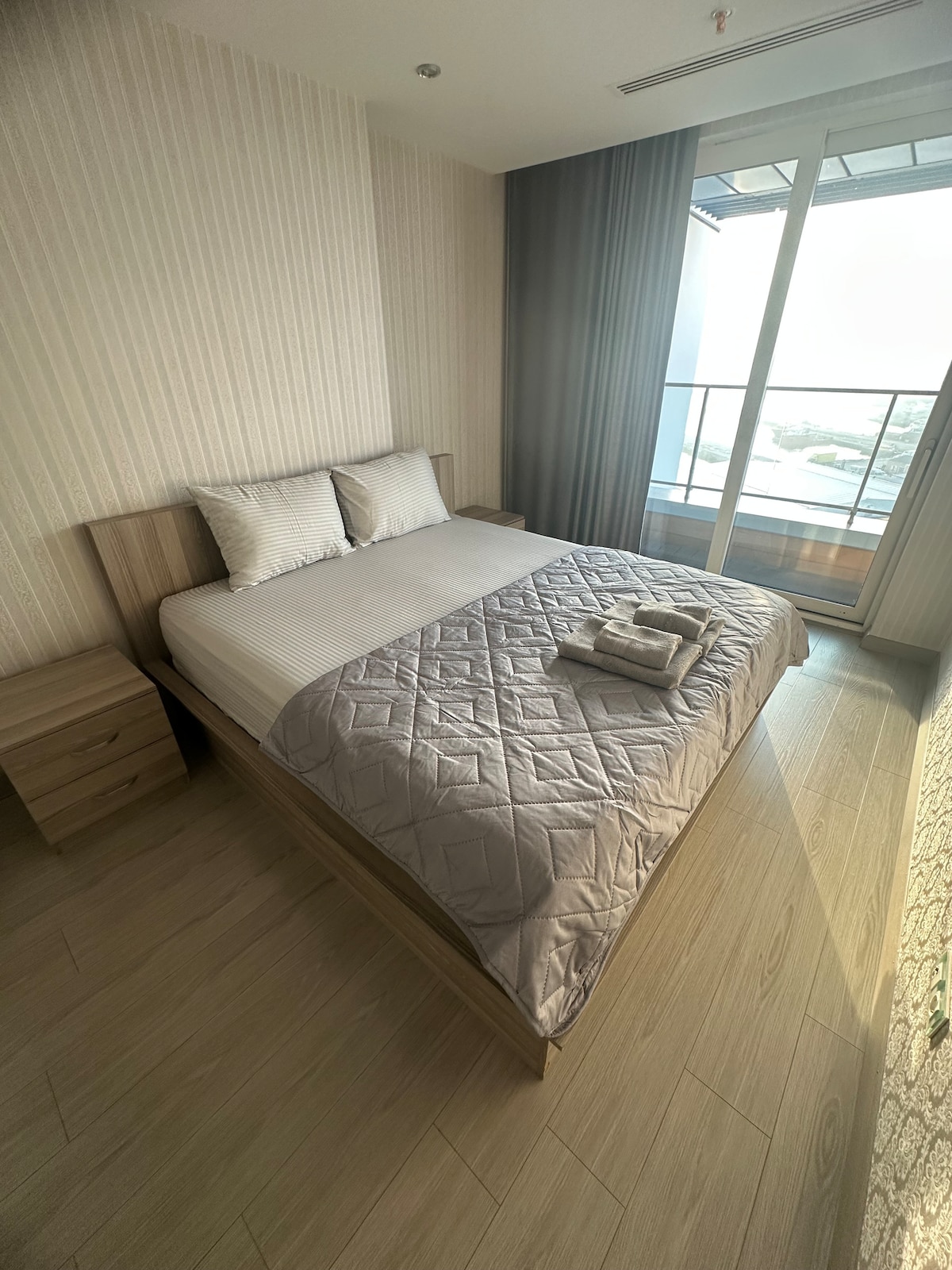 Las suites de lujo son residenciales. Nuestro apartamento tiene jacuzzi en el balcón Nuestros clientes pueden utilizar las instalaciones del hotel fácilmente. La piscina, el gimnasio y la sauna tienen un coste adicional. El apartamento tiene un aparcamiento separado y es gratuito El lugar está justo al lado del mar y tiene una hermosa vista al mar. El metro está a poca distancia Este apartamento tiene una vista al mar excepcional, donde puede disfrutar de la puesta de sol desde su sofá y dormitorio.