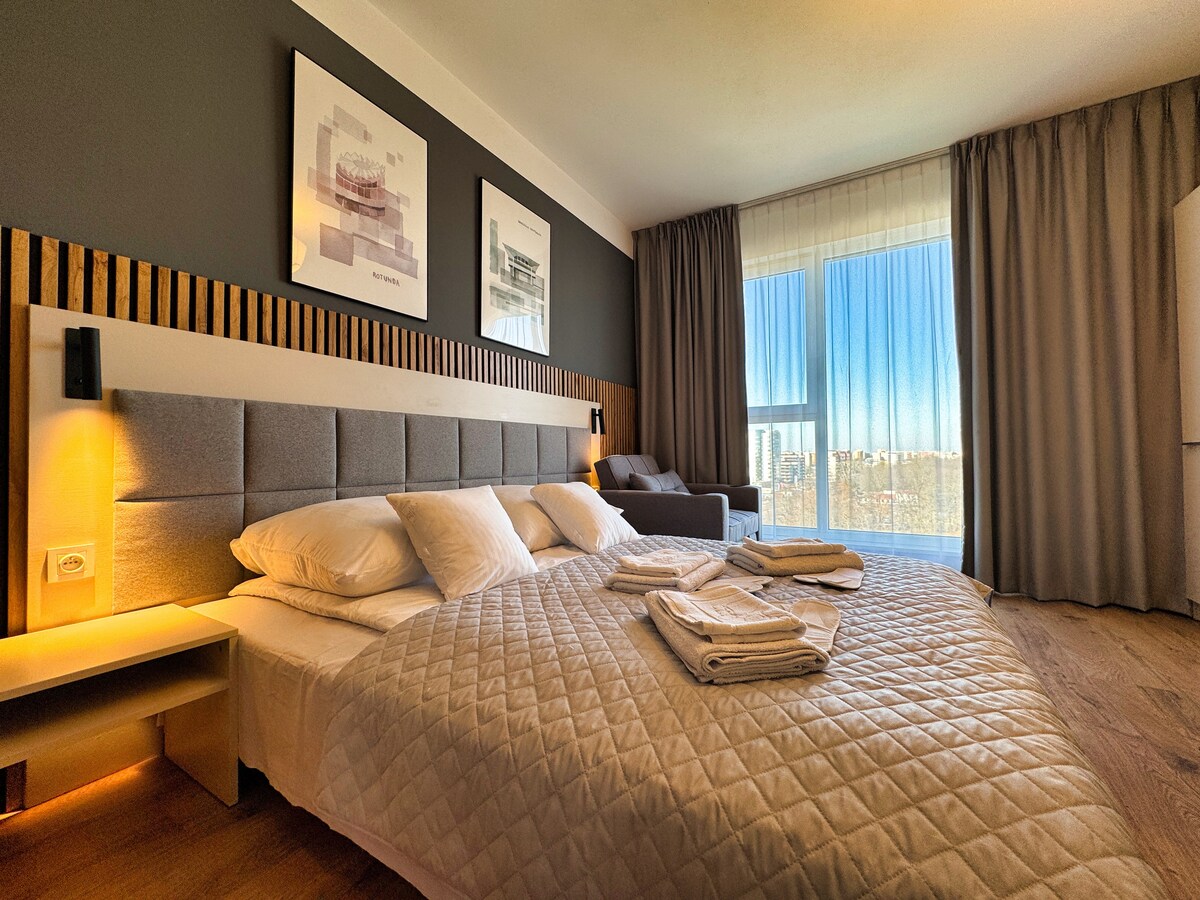 Apartamento cómodo y totalmente equipado en un edificio nuevo. Sala de estar con cocina abierta dividida en comedor y sala de estar. El dormitorio tiene una cama grande y un armario espacioso. También hay un armario como espacio de almacenamiento adicional. En la zona hay tiendas, restaurantes y cafeterías. Equipamiento: aire acondicionado, cafetera, hervidor de agua, plancha, tabla de planchar, lavadora Cómo llegar desde el aeropuerto de Chopin 20 minutos en taxi 50 minutos en transporte público desde el aeropuerto de Modlin 50 minutos en taxi 120 minutos en transporte público