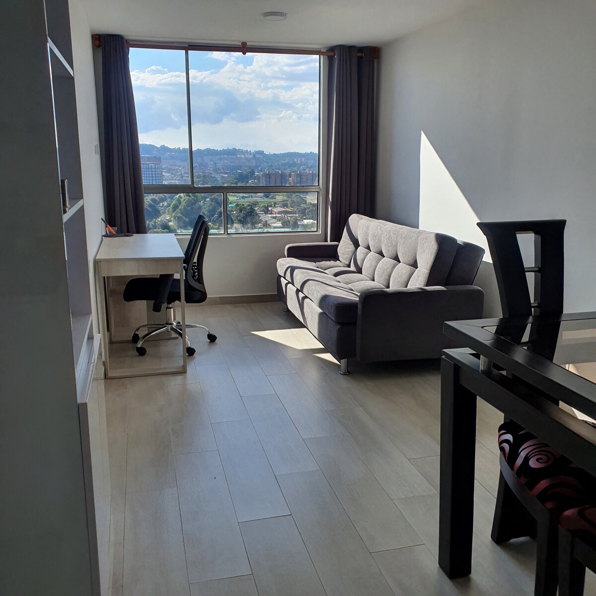 Excelente para contemplar el paisaje. El apartamento se encuentra ubicado en frente de la Alcaldía Municipal y a pocos pasos del Parque Principal, a dos cuadras de la zona más representativa de restaurantes y bares de Zipaquirá. Está ubicado en el tercer piso con una vista privilegiada hacia los cerros. Consta de una confortable habitación de una cama doble con baño privado, una amplia cocina, TV pantalla plana, televisión local por cable y Wi-Fi de alta velocidad.