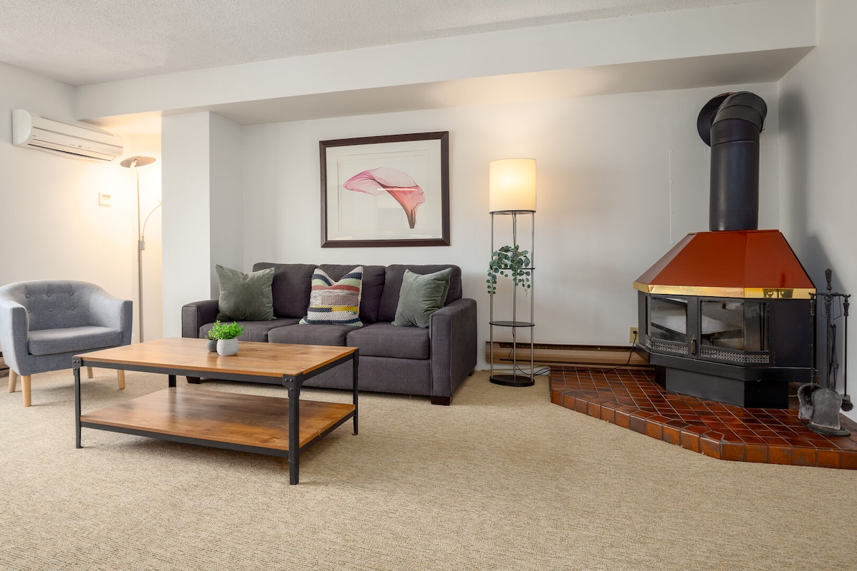 *Ahorra en las tarifas reducidas de principios de invierno debido al cierre del jacuzzi y el gimnasio* ¡Pueblo principal central con vistas al famoso paseo de Whistler Village! Renovado en julio de 2021. Este condominio estudio lo tiene TODO: ESTACIONAMIENTO GRATUITO (algunos lugares para vehículos eléctricos también), capacidad para 4 personas en la cama tamaño king y sofá cama tamaño queen, cocina totalmente surtida, experiencia de baño como baño con ducha de efecto lluvia, chimenea, TV inteligente de 50pulgadas con Netflix y cable, altavoz Sonos, iluminación regulable, lavandería en la habitación. A poca distancia a pie de telecabinas, tiendas y restaurantes.