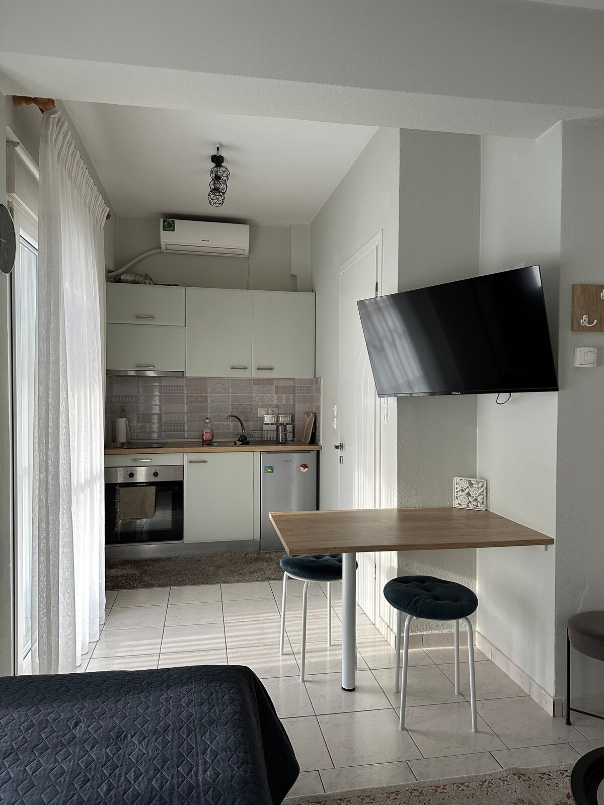 Un estudio sencillo, cálido y sencillo con aire acondicionado en la última planta del edificio en el centro de la ciudad, con balcón y toldo en un lado tranquilo del edificio. A 150 metros de la plaza principal de Komotini. Panadería a 20 metros, pizzería en el mismo edificio, cafetería tradicional y varias cafeterías y tiendas de buğatsa a 50 metros. Tiene todas las comodidades y un ordenador.