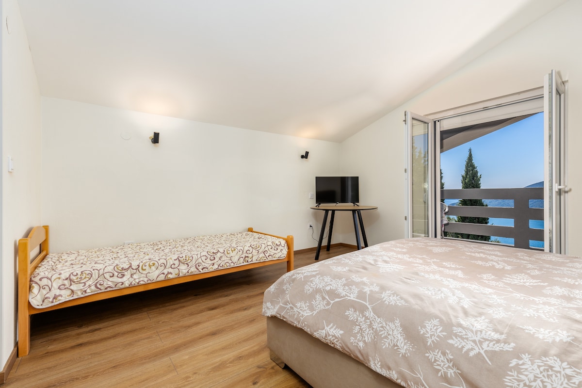 Apartment is located 220m (5 minutes walk) to the beach. It is placed on the hill side which brings you to the panoramic view of Boka Bay, from the balcony. Neighbourhood is quite with a lot of nature surrounding the area. Apartment is on the top of the house (second floor) that is separated from the rest of the house with own entrance and a lot of privacy.